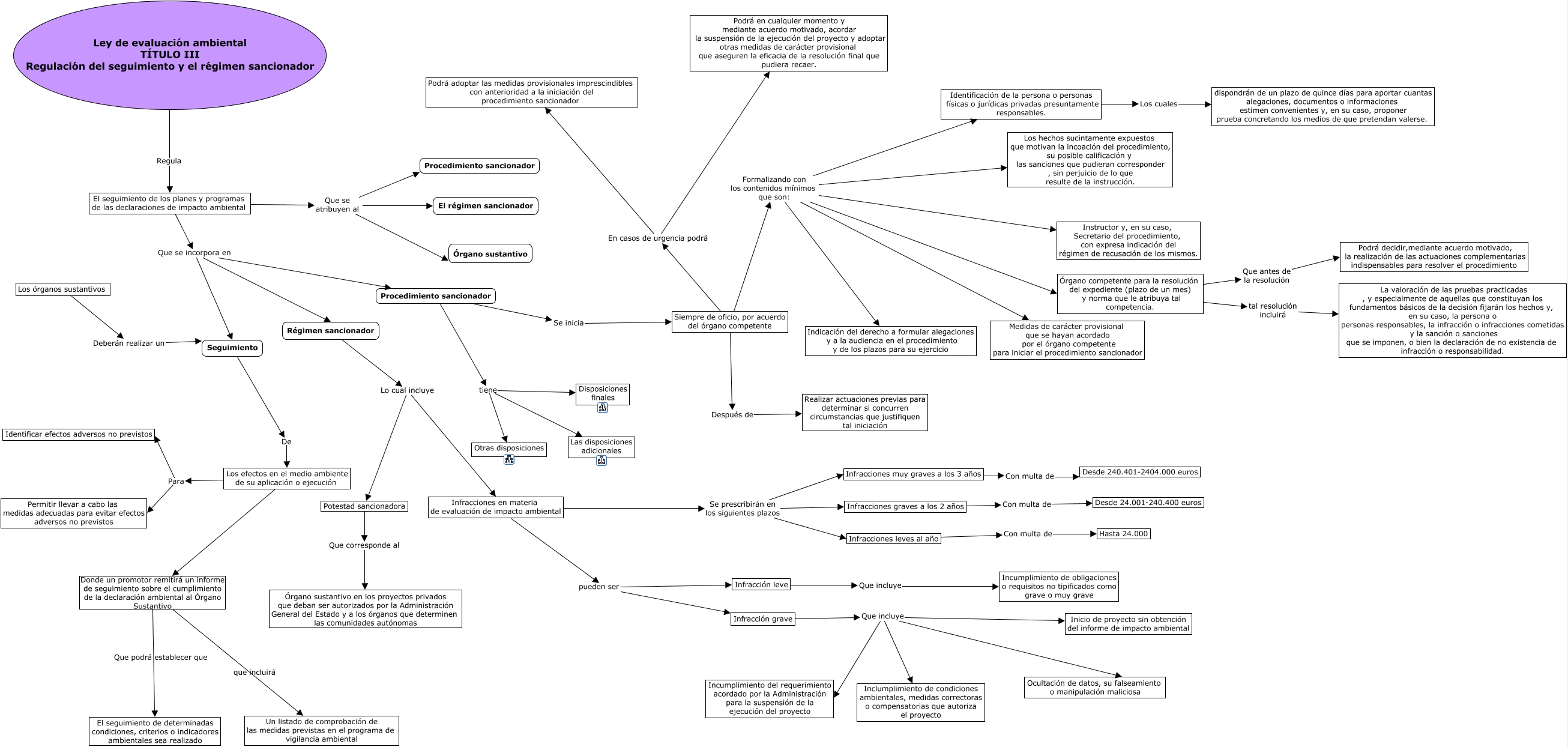 This Concept Map, created with IHMC CmapTools, has information related to: Título III, Infracciones graves a los 2 años Con multa de Desde 24.001-240.400 euros, Siempre de oficio, por acuerdo del órgano competente En casos de urgencia podrá Podrá en cualquier momento y mediante acuerdo motivado, acordar la suspensión de la ejecución del proyecto y adoptar otras medidas de carácter provisional que aseguren la eficacia de la resolución final que pudiera recaer., Infracciones en materia de evaluación de impacto ambiental pueden ser Infracción leve, Infracciones en materia de evaluación de impacto ambiental pueden ser Infracción grave, Los efectos en el medio ambiente de su aplicación o ejecución Donde un promotor remitirá un informe de seguimiento sobre el cumplimiento de la declaración ambiental al Órgano Sustantivo El seguimiento de determinadas condiciones, criterios o indicadores ambientales sea realizado, Infracción grave Que incluye Incumplimiento del requerimiento acordado por la Administración para la suspensión de la ejecución del proyecto, Procedimiento sancionador Se inicia Siempre de oficio, por acuerdo del órgano competente, Los órganos sustantivos Deberán realizar un Seguimiento, Infracción grave Que incluye Ocultación de datos, su falseamiento o manipulación maliciosa, Identificación de la persona o personas físicas o jurídicas privadas presuntamente responsables. Los cuales dispondrán de un plazo de quince días para aportar cuantas alegaciones, documentos o informaciones estimen convenientes y, en su caso, proponer prueba concretando los medios de que pretendan valerse., El seguimiento de los planes y programas de las declaraciones de impacto ambiental Que se atribuyen al Procedimiento sancionador, Infracciones leves al año Con multa de Hasta 24.000, Procedimiento sancionador tiene Otras disposiciones, Procedimiento sancionador tiene Disposiciones finales, Siempre de oficio, por acuerdo del órgano competente Formalizando con los contenidos mínimos que son: Órgano competente para la resolución del expediente (plazo de un mes) y norma que le atribuya tal competencia., Siempre de oficio, por acuerdo del órgano competente Formalizando con los contenidos mínimos que son: Indicación del derecho a formular alegaciones y a la audiencia en el procedimiento y de los plazos para su ejercicio, El seguimiento de los planes y programas de las declaraciones de impacto ambiental Que se incorpora en Seguimiento, Siempre de oficio, por acuerdo del órgano competente En casos de urgencia podrá Podrá adoptar las medidas provisionales imprescindibles con anterioridad a la iniciación del procedimiento sancionador, Los efectos en el medio ambiente de su aplicación o ejecución Donde un promotor remitirá un informe de seguimiento sobre el cumplimiento de la declaración ambiental al Órgano Sustantivo Un listado de comprobación de las medidas previstas en el programa de vigilancia ambiental, Potestad sancionadora Que corresponde al Órgano sustantivo en los proyectos privados que deban ser autorizados por la Administración General del Estado y a los órganos que determinen las comunidades autónomas