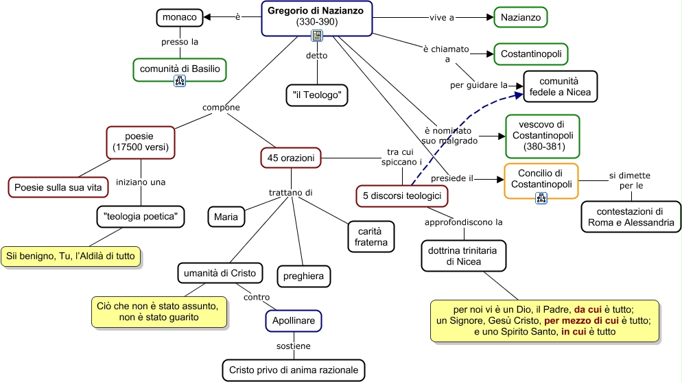 Questa Cmap, creata con IHMC CmapTools, contiene informazioni relative a: 72 Gregorio di Nazianzo, 45 orazioni trattano di carità fraterna, 45 orazioni trattano di Maria, Gregorio di Nazianzo (330-390) detto "il Teologo", Gregorio di Nazianzo (330-390) è chiamato a Costantinopoli, Gregorio di Nazianzo (330-390) compone poesie (17500 versi), 5 discorsi teologici comunità fedele a Nicea, Gregorio di Nazianzo (330-390) compone 45 orazioni, Apollinare sostiene Cristo privo di anima razionale, "teologia poetica" Sii benigno, Tu, l’Aldilà di tutto, 45 orazioni trattano di umanità di Cristo, 5 discorsi teologici approfondiscono la dottrina trinitaria di Nicea, poesie (17500 versi) Poesie sulla sua vita, Gregorio di Nazianzo (330-390) è monaco, Gregorio di Nazianzo (330-390) presiede il Concilio di Costantinopoli, Gregorio di Nazianzo (330-390) vive a Nazianzo, Gregorio di Nazianzo (330-390) è chiamato a per guidare la comunità fedele a Nicea, monaco presso la comunità di Basilio, umanità di Cristo contro Apollinare, poesie (17500 versi) iniziano una "teologia poetica", Concilio di Costantinopoli si dimette per le contestazioni di Roma e Alessandria