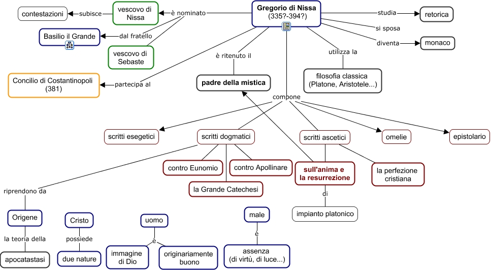 Questa Cmap, creata con IHMC CmapTools, contiene informazioni relative a: 73 Gregorio di Nissa, sull'anima e la resurrezione padre della mistica, Gregorio di Nissa (335?-394?) compone omelie, Gregorio di Nissa (335?-394?) utilizza la filosofia classica (Platone, Aristotele...), uomo è immagine di Dio, scritti dogmatici contro Eunomio, scritti dogmatici contro Apollinare, Cristo possiede due nature, Gregorio di Nissa (335?-394?) diventa monaco, scritti dogmatici la Grande Catechesi, sull'anima e la resurrezione di impianto platonico, scritti dogmatici riprendono da Origene, Gregorio di Nissa (335?-394?) è nominato vescovo di Sebaste, Gregorio di Nissa (335?-394?) compone epistolario, uomo è originariamente buono, Gregorio di Nissa (335?-394?) partecipa al Concilio di Costantinopoli (381), Gregorio di Nissa (335?-394?) è nominato vescovo di Nissa, male è assenza (di virtù, di luce...), Gregorio di Nissa (335?-394?) è nominato dal fratello Basilio il Grande, Gregorio di Nissa (335?-394?) compone scritti esegetici, Gregorio di Nissa (335?-394?) è ritenuto il padre della mistica