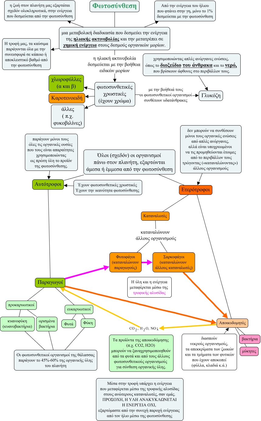 Αυτός ο εννοιολογικός χάρτης, που δημιουργήθηκε με το IHMC Cmap Tools, περιέχει πλήροφορίες που σχετίζονται με: φωτοσύνθεση-1, προκαρυωτικοί κυανοφύκη (κυανοβακτήρια), μια μεταβολική διαδικασία που δεσμεύει την ενέργεια της ηλιακής ακτινοβολίας και την μετατρέπει σε χημική ενέργεια στους δεσμούς οργανικών μορίων. Η τροφή μας, τα καύσιμα παράγονται όλα με την συνεισφορά σε κάποιο ή αποκλειστικό βαθμό από την φωτοσύνθεση, προκαρυωτικοί ορισμένα βακτήρια, Παραγωγοί ευκαρυωτικοί, ορισμένα βακτήρια Οι φωτοσυνθετικοί οργανισμοί της θάλασσας παράγουν το 45%-60% της οργανικής ύλης του πλανήτη, Παραγωγοί Αποικοδομητές, Έχουν φωτοσυνθετικές χρωστικές Έχουν την ικανότητα φωτοσύνθεσης Αυτότροφοι, Σαρκοφάγοι (καταναλώνουν άλλους καταναλωτές) Αποικοδομητές, Ετερότροφοι Αποικοδομητές, Όλοι (σχεδόν) οι οργανισμοί πάνω στον πλανήτη, εξαρτώνται άμεσα ή έμμεσα από την φωτοσύνθεση Αυτότροφοι, Ετερότροφοι Καταναλωτές, παράγουν μόνοι τους όλες τις οργανικές ουσίες που τους είναι απαραίτητες χρησιμοποιώντας ως πρώτη ύλη το προϊόν της φωτοσύνθεσης. Αυτότροφοι, Καταναλωτές καταναλώνουν άλλους οργανισμούς Φυτοφάγοι (καταναλώνουν παραγωγούς), φωτοσυνθετικές χρωστικές (έχουν χρώμα) άλλες ( π.χ. φυκοβιλίνες), Καταναλωτές καταναλώνουν άλλους οργανισμούς Σαρκοφάγοι (καταναλώνουν άλλους καταναλωτές), Φυτοφάγοι (καταναλώνουν παραγωγούς) Σαρκοφάγοι (καταναλώνουν άλλους καταναλωτές), διασπούν νεκρούς οργανισμούς, τα απεκκρίματα των ζωικών και τα τμήματα των φυτικών που έχουν αποκοπεί (φύλλα, κλαδιά κ.ά.) Αποικοδομητές, φωτοσυνθετικές χρωστικές (έχουν χρώμα) χλωροφύλλες (α και β), Αυτότροφοι Παραγωγοί, ευκαρυωτικοί Φυτά