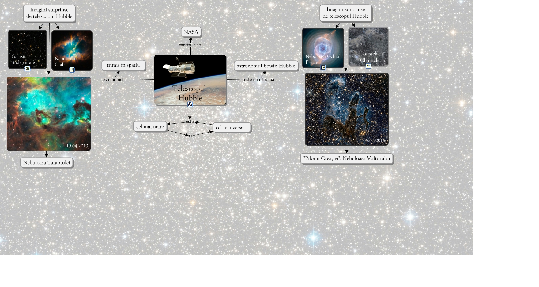 This Concept Map, created with IHMC CmapTools, has information related to: Telescopul Hubble, Imagini surprinse de telescopul Hubble ???? Galaxii îndepartate, Imagini surprinse de telescopul Hubble 19.04.2013, Telescopul Hubble construit de NASA, Imagini surprinse de telescopul Hubble ???? Neboloasa Ochiul Pisicii, cel mai mare și cel mai versatil, Telescopul Hubble este cel mai mare, Telescopul Hubble este numit după astronomul Edwin Hubble, 19.04.2013 ???? Nebuloasa Tarantulei, Imagini surprinse de telescopul Hubble ???? Constelatia Chameleon, Imagini surprinse de telescopul Hubble ???? Nebuloasa Crab, Imagini surprinse de telescopul Hubble 05.01.2015, 05.01.2015 ???? "Pilonii Creației", Nebuloasa Vulturului, Telescopul Hubble este primul trimis în spațiu, cel mai versatil este cel mai mare
