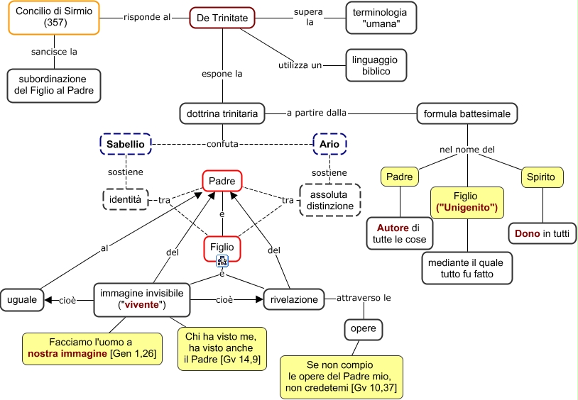 Questa Cmap, creata con IHMC CmapTools, contiene informazioni relative a: 76 Ilario di Poitiers - Sulla Trinità, immagine invisibile ("vivente") Facciamo l'uomo a nostra immagine [Gen 1,26], immagine invisibile ("vivente") cioè rivelazione, identità tra Figlio, Figlio è rivelazione, rivelazione attraverso le opere, formula battesimale nel nome del Figlio ("Unigenito"), Sabellio sostiene identità, rivelazione del Padre, Padre e Figlio, Spirito Dono in tutti, identità tra Padre, assoluta distinzione tra Figlio, De Trinitate espone la dottrina trinitaria, uguale al Padre, Ario sostiene assoluta distinzione, Figlio ("Unigenito") mediante il quale tutto fu fatto, De Trinitate utilizza un linguaggio biblico, formula battesimale nel nome del Padre, immagine invisibile ("vivente") del Padre, Figlio è immagine invisibile ("vivente")
