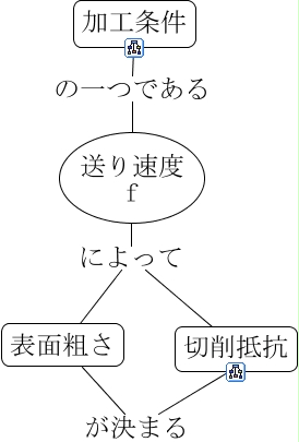 このコンセプトマップに関連する情報: 送り速度とは, 表面粗さ が決まる 切削抵抗, 送り速度 f によって 表面粗さ, 送り速度 f によって 切削抵抗, 加工条件 の一つである 送り速度 f