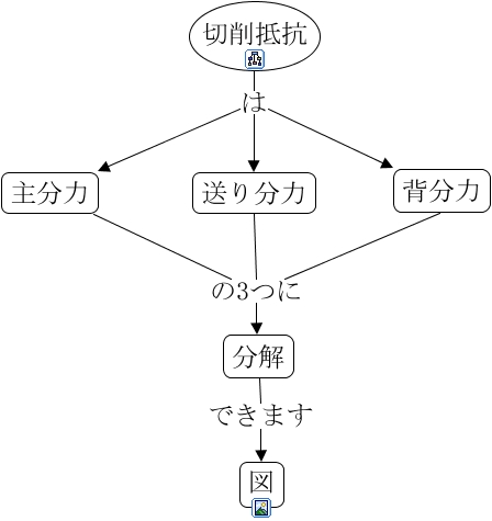 このコンセプトマップに関連する情報: 切削抵抗とは, 主分力 の3つに 分解, 切削抵抗 は 背分力, 主分力 の3つに 背分力, 分解 できます 図, 切削抵抗 は 送り分力, 主分力 の3つに 送り分力, 切削抵抗 は 主分力