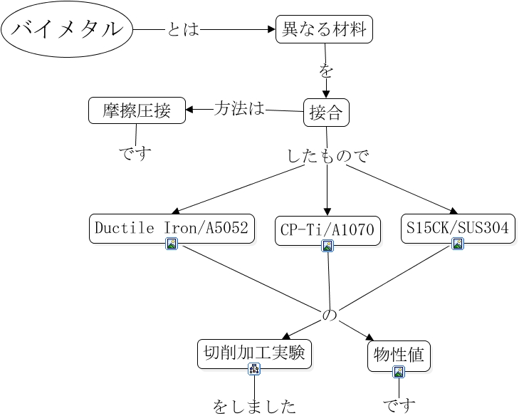 このコンセプトマップに関連する情報: バイメタルの説明, Ductile Iron/A5052 の 物性値, CP-Ti/A1070 の 物性値, バイメタル とは 異なる材料, 異なる材料 を 接合, CP-Ti/A1070 の 切削加工実験, S15CK/SUS304 の 切削加工実験, 接合 したもので CP-Ti/A1070, 接合 方法は 摩擦圧接, Ductile Iron/A5052 の 切削加工実験, 接合 したもので S15CK/SUS304, 接合 したもので Ductile Iron/A5052, S15CK/SUS304 の 物性値