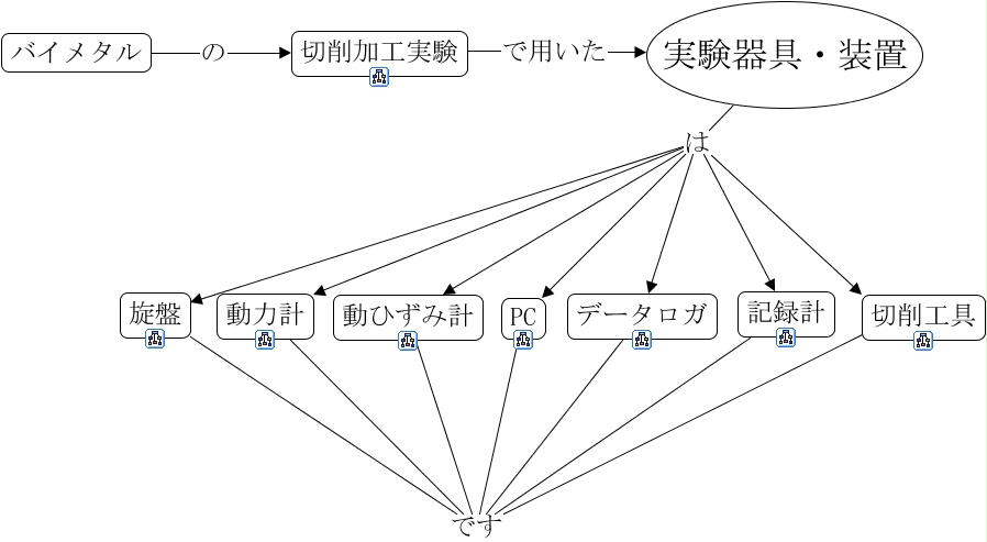 このコンセプトマップに関連する情報: 実験器具・装置, 実験器具・装置 は 動力計, 実験器具・装置 は 切削工具, 実験器具・装置 は 旋盤, 実験器具・装置 は PC, 切削工具 です 記録計, バイメタル の 切削加工実験, 切削加工実験 で用いた 実験器具・装置, 実験器具・装置 は 記録計, 切削工具 です データロガ, 旋盤 です 動力計, 実験器具・装置 は 動ひずみ計, 切削工具 です PC, 実験器具・装置 は データロガ, 旋盤 です 動ひずみ計, 旋盤 です データロガ, 切削工具 です 動ひずみ計, 旋盤 です PC, 旋盤 です 記録計, 切削工具 です 動力計
