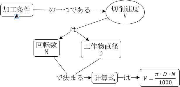 このコンセプトマップに関連する情報: 切削速度とは, 切削速度 V は 回転数 N, 工作物直径 D で決まる 計算式, 加工条件 の一つである 切削速度 V, 計算式 は, 回転数 N で決まる 計算式, 切削速度 V は 工作物直径 D