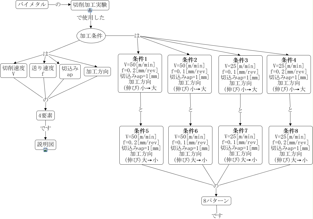 このコンセプトマップに関連する情報: 実験の加工条件, 加工条件 は 条件3 V=25[m/min] f=0.1[mm/rev] 切込みap=1[mm] 加工方向 (伸び)小→大, 切削速度 V の 4要素, 条件2 V=50[m/min] f=0.1[mm/rev] 切込みap=1[mm] 加工方向 (伸び)小→大 と 条件6 V=50[m/min] f=0.1[mm/rev] 切込みap=1[mm] 加工方向 (伸び)大→小, 条件5 V=50[m/min] f=0.2[mm/rev] 切込みap=1[mm] 加工方向 (伸び)大→小 の 8パターン, 条件4 V=25[m/min] f=0.2[mm/rev] 切込みap=1[mm] 加工方向 (伸び)小→大 と 条件8 V=25[m/min] f=0.2[mm/rev] 切込みap=1[mm] 加工方向 (伸び)大→小, 切削加工実験 で使用した 加工条件, 切削速度 V の 送り速度 f, 4要素 です 説明図, 加工条件 は 送り速度 f, 加工条件 は 切込み ap, バイメタル の 切削加工実験, 条件5 V=50[m/min] f=0.2[mm/rev] 切込みap=1[mm] 加工方向 (伸び)大→小 の 条件6 V=50[m/min] f=0.1[mm/rev] 切込みap=1[mm] 加工方向 (伸び)大→小, 加工条件 は 切削速度 V, 加工条件 は 条件2 V=50[m/min] f=0.1[mm/rev] 切込みap=1[mm] 加工方向 (伸び)小→大, 切削速度 V の 加工方向, 条件1 V=50[m/min] f=0.2[mm/rev] 切込みap=1[mm] 加工方向 (伸び)小→大 と 条件5 V=50[m/min] f=0.2[mm/rev] 切込みap=1[mm] 加工方向 (伸び)大→小, 加工条件 は 条件4 V=25[m/min] f=0.2[mm/rev] 切込みap=1[mm] 加工方向 (伸び)小→大, 切削速度 V の 切込み ap, 条件3 V=25[m/min] f=0.1[mm/rev] 切込みap=1[mm] 加工方向 (伸び)小→大 と 条件7 V=25[m/min] f=0.1[mm/rev] 切込みap=1[mm] 加工方向 (伸び)大→小, 条件5 V=50[m/min] f=0.2[mm/rev] 切込みap=1[mm] 加工方向 (伸び)大→小 の 条件7 V=25[m/min] f=0.1[mm/rev] 切込みap=1[mm] 加工方向 (伸び)大→小