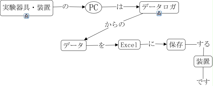 このコンセプトマップに関連する情報: PCとは, 保存 する 装置, データ を Excel, Excel に 保存, データロガ からの データ, 実験器具・装置 の PC, PC は データロガ