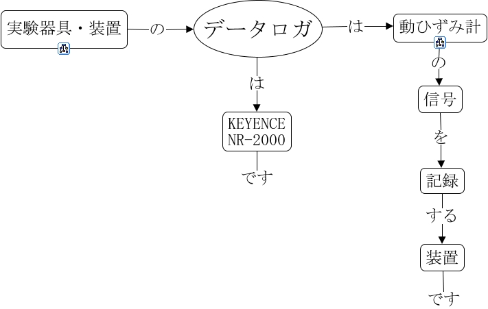 このコンセプトマップに関連する情報: データロガとは, 記録 する 装置, 動ひずみ計 の 信号, データロガ は 動ひずみ計, 信号 を 記録, 実験器具・装置 の データロガ, データロガ は KEYENCE NR-2000