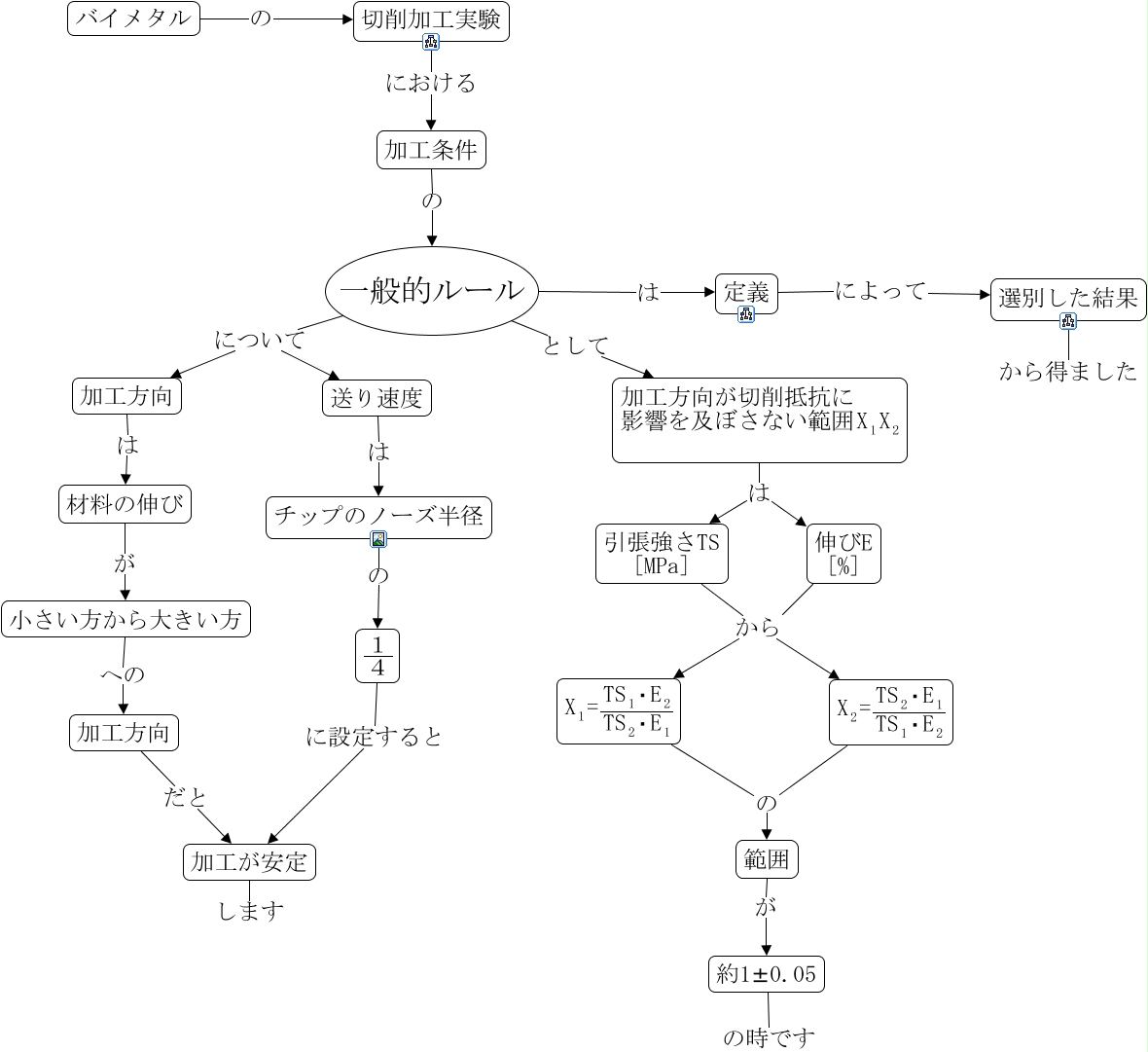 このコンセプトマップに関連する情報: バイメタルの一般的ルール, <math xmlns="http://www.w3.org/1998/Math/MathML"> <mrow> <mmultiscripts> <mtext> X </mtext> <mtext> 1 </mtext> <none/> </mmultiscripts> <mtext> = </mtext> <mfrac> <mrow> <mmultiscripts> <mtext> TS </mtext> <mtext> 1 </mtext> <none/> </mmultiscripts> <mtext> ⋅ </mtext> <mmultiscripts> <mtext> E </mtext> <mtext> 2 </mtext> <none/> </mmultiscripts> </mrow> <mrow> <mmultiscripts> <mtext> TS </mtext> <mtext> 2 </mtext> <none/> </mmultiscripts> <mtext> ⋅ </mtext> <mmultiscripts> <mtext> E </mtext> <mtext> 1 </mtext> <none/> </mmultiscripts> </mrow> </mfrac> </mrow> </math> の 範囲, 伸びE [%] から <math xmlns="http://www.w3.org/1998/Math/MathML"> <mrow> <mmultiscripts> <mtext> X </mtext> <mtext> 1 </mtext> <none/> </mmultiscripts> <mtext> = </mtext> <mfrac> <mrow> <mmultiscripts> <mtext> TS </mtext> <mtext> 1 </mtext> <none/> </mmultiscripts> <mtext> ⋅ </mtext> <mmultiscripts> <mtext> E </mtext> <mtext> 2 </mtext> <none/> </mmultiscripts> </mrow> <mrow> <mmultiscripts> <mtext> TS </mtext> <mtext> 2 </mtext> <none/> </mmultiscripts> <mtext> ⋅ </mtext> <mmultiscripts> <mtext> E </mtext> <mtext> 1 </mtext> <none/> </mmultiscripts> </mrow> </mfrac> </mrow> </math>, 範囲 が 約1±0.05, 切削加工実験 における 加工条件, 小さい方から大きい方 への 加工方向, 材料の伸び が 小さい方から大きい方, 引張強さTS [MPa] から <math xmlns="http://www.w3.org/1998/Math/MathML"> <mrow> <mmultiscripts> <mtext> X </mtext> <mtext> 2 </mtext> <none/> </mmultiscripts> <mtext> = </mtext> <mfrac> <mrow> <mmultiscripts> <mtext> TS </mtext> <mtext> 2 </mtext> <none/> </mmultiscripts> <mtext> ⋅ </mtext> <mmultiscripts> <mtext> E </mtext> <mtext> 1 </mtext> <none/> </mmultiscripts> </mrow> <mrow> <mmultiscripts> <mtext> TS </mtext> <mtext> 1 </mtext> <none/> </mmultiscripts> <mtext> ⋅ </mtext> <mmultiscripts> <mtext> E </mtext> <mtext> 2 </mtext> <none/> </mmultiscripts> </mrow> </mfrac> </mrow> </math>, バイメタル の 切削加工実験, 定義 によって 選別した結果, 伸びE [%] から <math xmlns="http://www.w3.org/1998/Math/MathML"> <mrow> <mmultiscripts> <mtext> X </mtext> <mtext> 2 </mtext> <none/> </mmultiscripts> <mtext> = </mtext> <mfrac> <mrow> <mmultiscripts> <mtext> TS </mtext> <mtext> 2 </mtext> <none/> </mmultiscripts> <mtext> ⋅ </mtext> <mmultiscripts> <mtext> E </mtext> <mtext> 1 </mtext> <none/> </mmultiscripts> </mrow> <mrow> <mmultiscripts> <mtext> TS </mtext> <mtext> 1 </mtext> <none/> </mmultiscripts> <mtext> ⋅ </mtext> <mmultiscripts> <mtext> E </mtext> <mtext> 2 </mtext> <none/> </mmultiscripts> </mrow> </mfrac> </mrow> </math>, 引張強さTS [MPa] から <math xmlns="http://www.w3.org/1998/Math/MathML"> <mrow> <mmultiscripts> <mtext> X </mtext> <mtext> 1 </mtext> <none/> </mmultiscripts> <mtext> = </mtext> <mfrac> <mrow> <mmultiscripts> <mtext> TS </mtext> <mtext> 1 </mtext> <none/> </mmultiscripts> <mtext> ⋅ </mtext> <mmultiscripts> <mtext> E </mtext> <mtext> 2 </mtext> <none/> </mmultiscripts> </mrow> <mrow> <mmultiscripts> <mtext> TS </mtext> <mtext> 2 </mtext> <none/> </mmultiscripts> <mtext> ⋅ </mtext> <mmultiscripts> <mtext> E </mtext> <mtext> 1 </mtext> <none/> </mmultiscripts> </mrow> </mfrac> </mrow> </math>, <math xmlns="http://www.w3.org/1998/Math/MathML"> <mrow> <mtext> 加工方向が切削抵抗に
