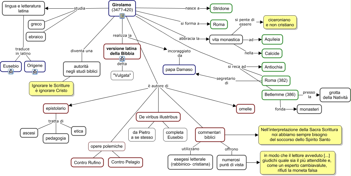 Questa Cmap, creata con IHMC CmapTools, contiene informazioni relative a: 78 Girolamo, opere polemiche Contro Pelagio, Girolamo (347?-420) studia greco, vita monastica nella Calcide, Girolamo (347?-420) si reca ad Roma (382), Girolamo (347?-420) realizza la incoraggiato da papa Damaso, Girolamo (347?-420) si forma a Roma, Roma (382) segretario di papa Damaso, lingua e letteratura latina traduce in latino Eusebio, Girolamo (347?-420) studia lingua e letteratura latina, Girolamo (347?-420) è autore di De viribus illustribus, De viribus illustribus completa Eusebio, vita monastica ad Aquileia, epistolario tratta di etica, Girolamo (347?-420) realizza la versione latina della Bibbia, versione latina della Bibbia detta "Vulgata", epistolario tratta di ascesi, numerosi punti di vista in modo che il lettore avveduto [...] giudichi quale sia il più attendibile e, come un esperto cambiavalute, rifiuti la moneta falsa, Girolamo (347?-420) è autore di opere polemiche, opere polemiche Contro Rufino, epistolario tratta di pedagogia