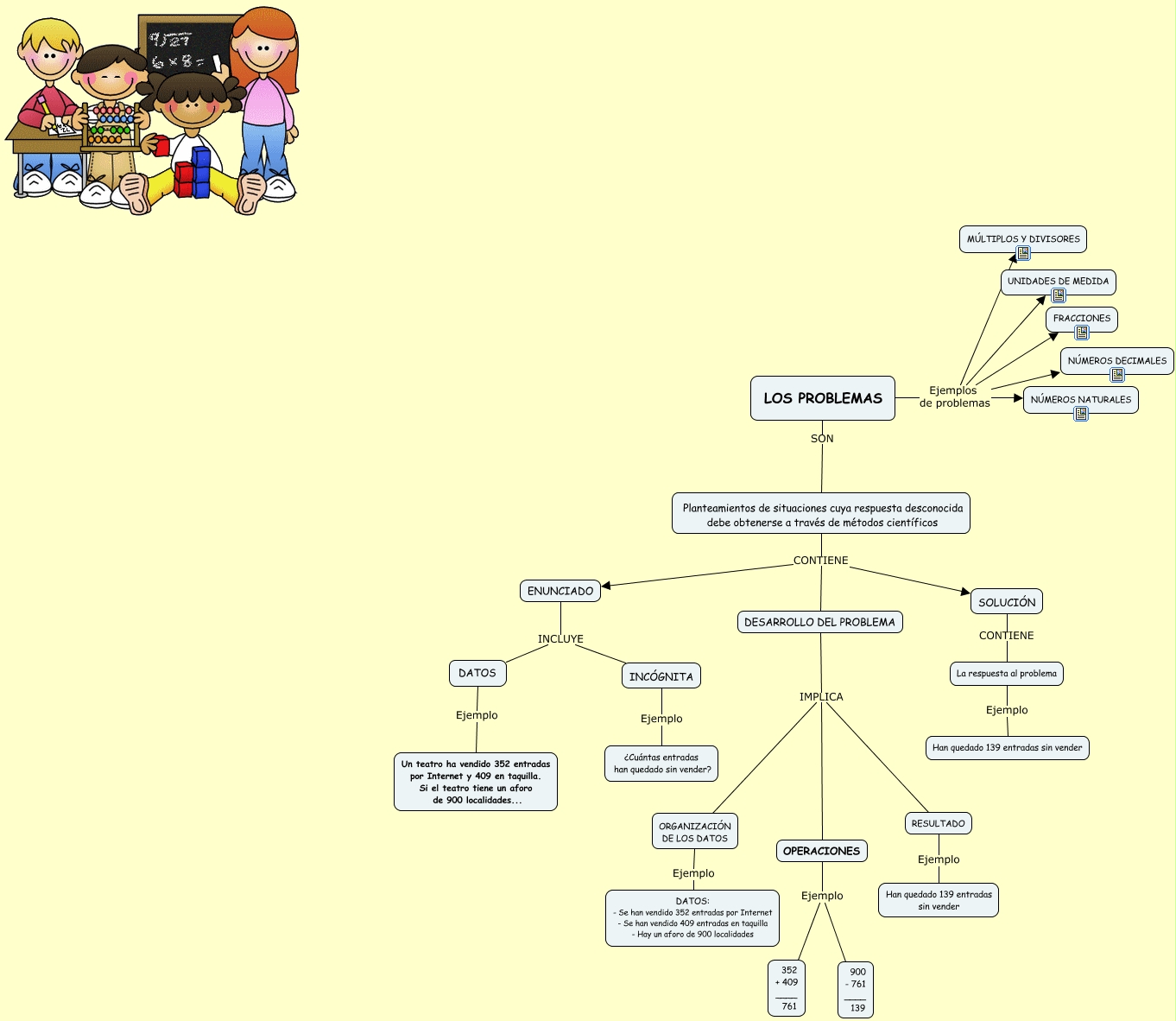 Este Cmap, tiene información relacionada con: LOS PROBLEMAS, DATOS Ejemplo Un teatro ha vendido 352 entradas por Internet y 409 en taquilla. Si el teatro tiene un aforo de 900 localidades..., LOS PROBLEMAS Ejemplos de problemas NÚMEROS DECIMALES, LOS PROBLEMAS Ejemplos de problemas NÚMEROS NATURALES, LOS PROBLEMAS Ejemplos de problemas MÚLTIPLOS Y DIVISORES, ENUNCIADO INCLUYE DATOS, LOS PROBLEMAS Ejemplos de problemas FRACCIONES, OPERACIONES Ejemplo 900 - 761 ____ 139, Planteamientos de situaciones cuya respuesta desconocida debe obtenerse a través de métodos científicos CONTIENE DESARROLLO DEL PROBLEMA, INCÓGNITA Ejemplo ¿Cuántas entradas han quedado sin vender?, LOS PROBLEMAS SON Planteamientos de situaciones cuya respuesta desconocida debe obtenerse a través de métodos científicos, ENUNCIADO INCLUYE INCÓGNITA, DESARROLLO DEL PROBLEMA IMPLICA OPERACIONES, Planteamientos de situaciones cuya respuesta desconocida debe obtenerse a través de métodos científicos CONTIENE ENUNCIADO, ORGANIZACIÓN DE LOS DATOS Ejemplo DATOS: - Se han vendido 352 entradas por Internet - Se han vendido 409 entradas en taquilla - Hay un aforo de 900 localidades, OPERACIONES Ejemplo 352 + 409 ____ 761, RESULTADO Ejemplo Han quedado 139 entradas sin vender, Planteamientos de situaciones cuya respuesta desconocida debe obtenerse a través de métodos científicos CONTIENE SOLUCIÓN, DESARROLLO DEL PROBLEMA IMPLICA RESULTADO, DESARROLLO DEL PROBLEMA IMPLICA ORGANIZACIÓN DE LOS DATOS, SOLUCIÓN CONTIENE La respuesta al problema