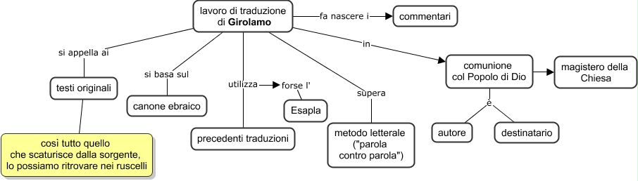Questa Cmap, creata con IHMC CmapTools, contiene informazioni relative a: 78 Girolamo - Traduzione, comunione col Popolo di Dio è destinatario, testi originali così tutto quello che scaturisce dalla sorgente, lo possiamo ritrovare nei ruscelli, lavoro di traduzione di Girolamo in comunione col Popolo di Dio, lavoro di traduzione di Girolamo utilizza forse l' Esapla, lavoro di traduzione di Girolamo utilizza precedenti traduzioni, lavoro di traduzione di Girolamo supera metodo letterale ("parola contro parola"), lavoro di traduzione di Girolamo si appella ai testi originali, lavoro di traduzione di Girolamo fa nascere i commentari, lavoro di traduzione di Girolamo si basa sul canone ebraico, comunione col Popolo di Dio è autore, comunione col Popolo di Dio magistero della Chiesa