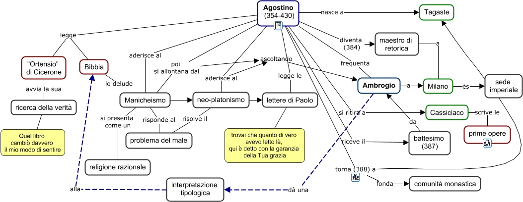Questa Cmap, creata con IHMC CmapTools, contiene informazioni relative a: 80.1 Agostino - Vita 1, Agostino (354-430) legge le lettere di Paolo, Milano ès sede imperiale, lettere di Paolo trovai che quanto di vero avevo letto là, qui è detto con la garanzia della Tua grazia, Agostino (354-430) riceve il battesimo (387), interpretazione tipologica alla Bibbia, Ambrogio dà una interpretazione tipologica, Agostino (354-430) nasce a Tagaste, Agostino (354-430) aderisce al neo-platonismo, battesimo (387) da Ambrogio, Agostino (354-430) poi si allontana dal ascoltando Ambrogio, Manicheismo neo-platonismo, maestro di retorica a Milano, Agostino (354-430) aderisce al ascoltando Ambrogio, Agostino (354-430) legge "Ortensio" di Cicerone, Agostino (354-430) diventa (384) maestro di retorica, Manicheismo si presenta come un religione razionale, "Ortensio" di Cicerone avvia la sua ricerca della verità, Agostino (354-430) legge Bibbia, neo-platonismo risolve il problema del male, Cassiciaco scrive le prime opere