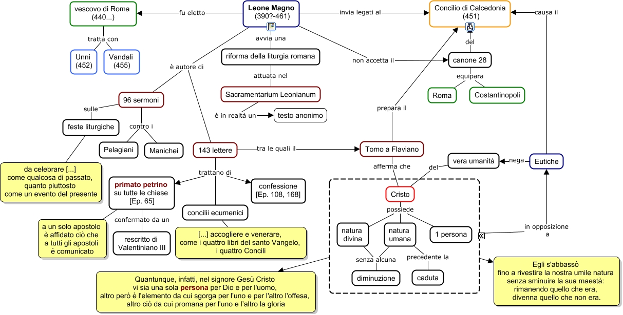 Questa Cmap, creata con IHMC CmapTools, contiene informazioni relative a: 82 Leone Magno, vera umanità del Cristo, Leone Magno (390?-461) non accetta il canone 28, primato petrino su tutte le chiese [Ep. 65] a un solo apostolo è affidato ciò che a tutti gli apostoli è comunicato, Leone Magno (390?-461) è autore di 96 sermoni, 143 lettere trattano di confessione [Ep. 108, 168], vescovo di Roma (440...) tratta con Unni (452), ???? Quantunque, infatti, nel signore Gesù Cristo vi sia una sola persona per Dio e per l'uomo, altro però è l'elemento da cui sgorga per l'uno e per l'altro l'offesa, altro ciò da cui promana per l'uno e l’altro la gloria, Eutiche causa il Concilio di Calcedonia (451), Eutiche nega vera umanità, Tomo a Flaviano afferma che Cristo, vescovo di Roma (440...) tratta con Vandali (455), Leone Magno (390?-461) è autore di 143 lettere, primato petrino su tutte le chiese [Ep. 65] confermato da un rescritto di Valentiniano III, riforma della liturgia romana attuata nel Sacramentarium Leonianum, 96 sermoni contro i Manichei, Cristo possiede natura divina, ???? Egli s'abbassò fino a rivestire la nostra umile natura senza sminuire la sua maestà: rimanendo quello che era, divenna quello che non era., natura divina senza alcuna diminuzione, natura umana precedente la caduta, 143 lettere trattano di concilii ecumenici