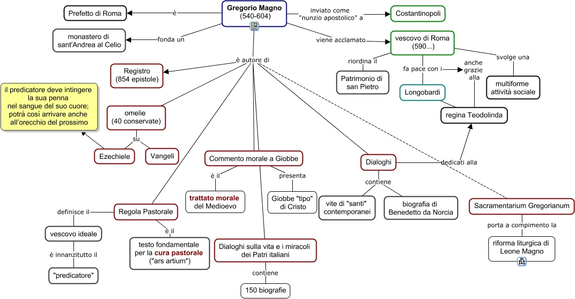 Questa Cmap, creata con IHMC CmapTools, contiene informazioni relative a: 83 Gregorio Magno, Dialoghi dedicati alla regina Teodolinda, Ezechiele il predicatore deve intingere la sua penna nel sangue del suo cuore; potrà così arrivare anche all’orecchio del prossimo, Longobardi regina Teodolinda, Gregorio Magno (540-604) è autore di Regola Pastorale, Dialoghi contiene biografia di Benedetto da Norcia, vescovo di Roma (590...) riordina il Patrimonio di san Pietro, Dialoghi sulla vita e i miracoli dei Patri italiani contiene 150 biografie, omelie (40 conservate) su Vangeli, Gregorio Magno (540-604) è autore di Dialoghi sulla vita e i miracoli dei Patri italiani, Gregorio Magno (540-604) è autore di omelie (40 conservate), Gregorio Magno (540-604) inviato come "nunzio apostolico" a Costantinopoli, Dialoghi contiene vite di "santi" contemporanei, Gregorio Magno (540-604) è autore di Commento morale a Giobbe, vescovo ideale è innanzitutto il "predicatore", vescovo di Roma (590...) fa pace con i anche grazie alla regina Teodolinda, Gregorio Magno (540-604) viene acclamato vescovo di Roma (590...), Gregorio Magno (540-604) è autore di Registro (854 epistole), Gregorio Magno (540-604) fonda un monastero di sant'Andrea al Celio, vescovo di Roma (590...) fa pace con i Longobardi, Regola Pastorale definisce il vescovo ideale