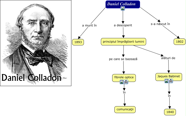 This Concept Map, created with IHMC CmapTools, has information related to: Daniel Colladon, Daniel Colladon a descoperit principiul împrăştierii lumini, principiul împrăştierii lumini pe care se bazează fibrele optice, Daniel Colladon s-a născut în 1802, Jaques Babinet în 1840, Daniel Colladon a murit în 1893, fibrele optice în comunicaţii, principiul împrăştierii lumini alături de Jaques Babinet
