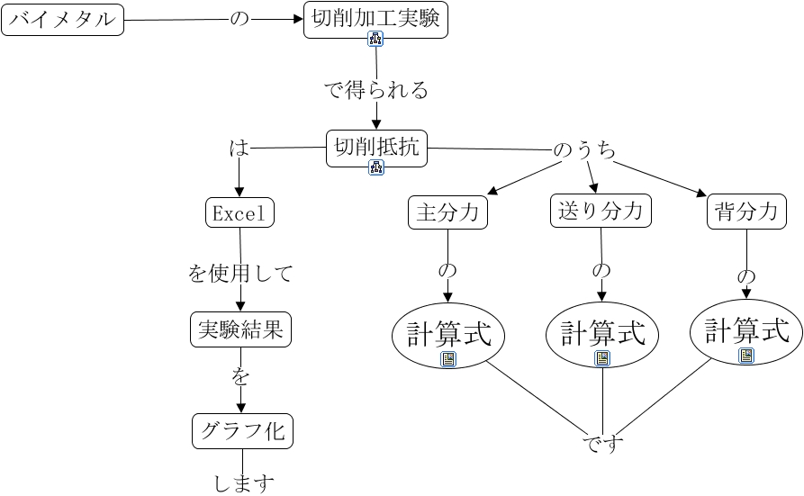 このコンセプトマップに関連する情報: 切削抵抗の計算式, 背分力 の 計算式, 切削加工実験 で得られる 切削抵抗, 切削抵抗 のうち 背分力, 実験結果 を グラフ化, 主分力 の 計算式, 切削抵抗 のうち 送り分力, 送り分力 の 計算式, 切削抵抗 のうち 主分力, 切削抵抗 は Excel, Excel を使用して 実験結果, バイメタル の 切削加工実験
