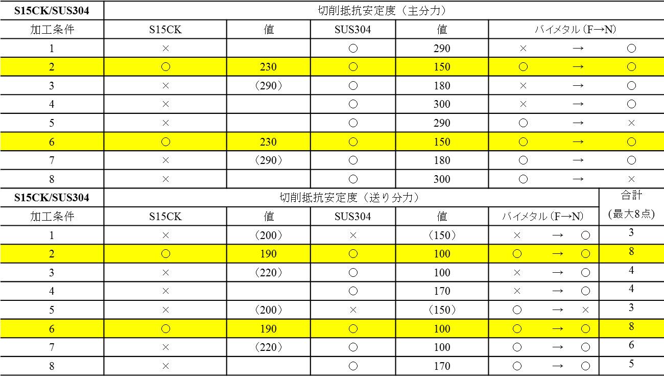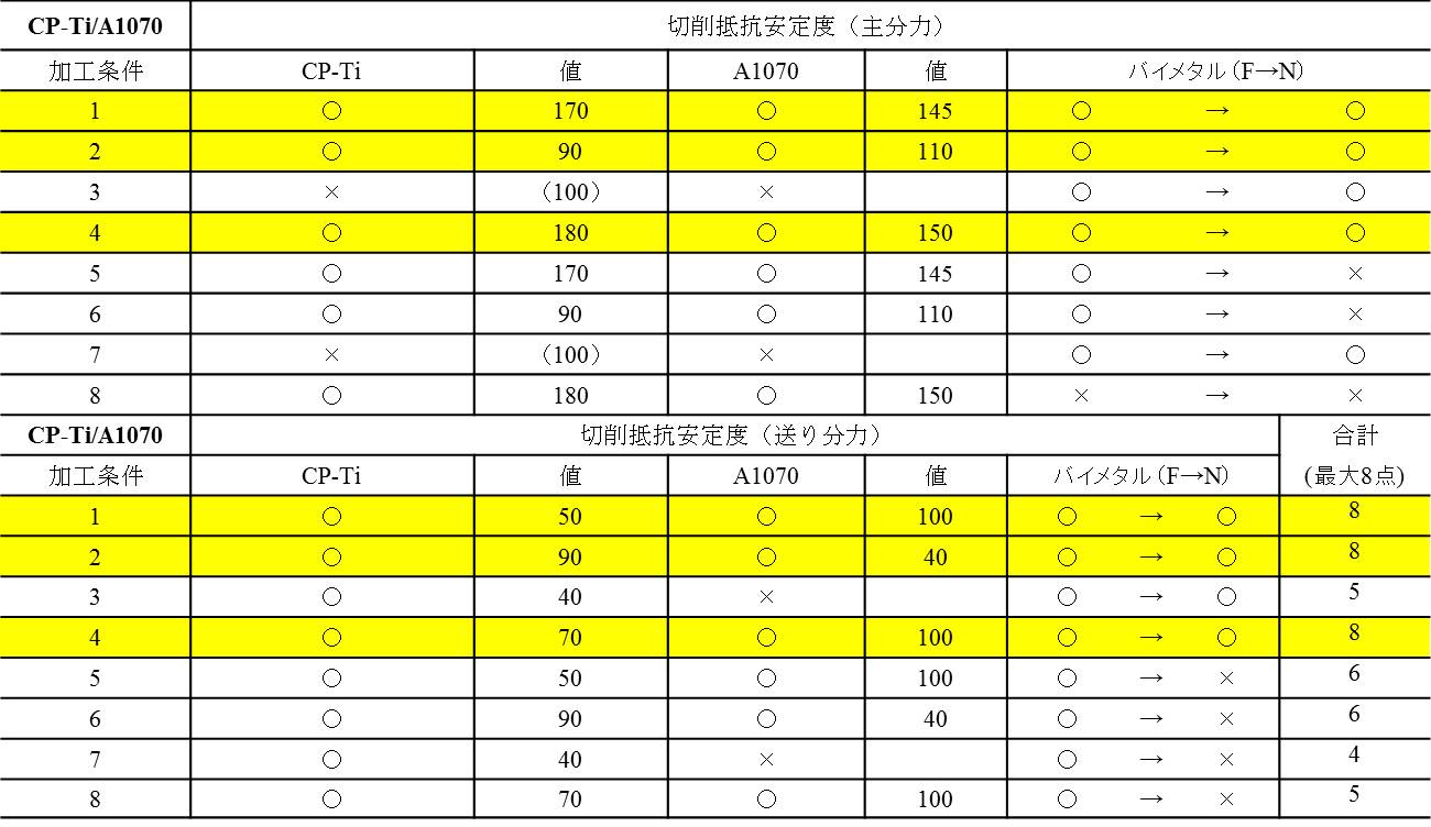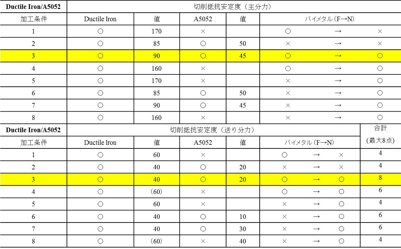 切削抵抗に加工方向が影響しない範囲の計算結果.cmap 合計点が一番高かった加工条件.cmap 定義によって選別した結果.cmap 物性値.jpg 選別結果表まとめ(CP-Ti_A1070).jpg 選別結果表まとめ(Ductile Iron_A5052).jpg 選別結果表まとめ(S15CK_SUS304).jpg