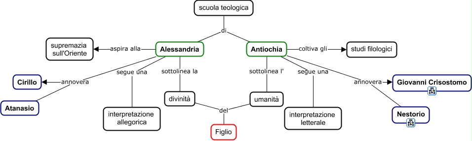 Questa Cmap, creata con IHMC CmapTools, contiene informazioni relative a: 100 Alessandria vs Antiochia, Alessandria aspira alla supremazia sull'Oriente, Alessandria segue una interpretazione allegorica, Antiochia segue una interpretazione letterale, divinità del Figlio, Antiochia sottolinea l' umanità, Antiochia annovera Giovanni Crisostomo, Alessandria annovera Cirillo, umanità del Figlio, Alessandria sottolinea la divinità, Antiochia annovera Nestorio, scuola teologica di Alessandria, Antiochia coltiva gli studi filologici, scuola teologica di Antiochia, Alessandria annovera Atanasio