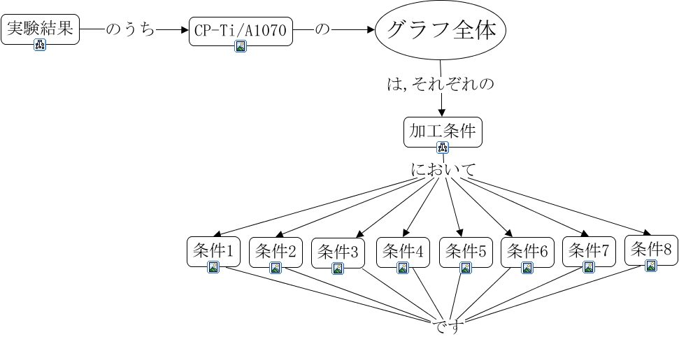 このコンセプトマップに関連する情報: CP-Ti_A1070(グラフ全体), グラフ全体 は,それぞれの 加工条件, 加工条件 において 条件4, CP-Ti/A1070 の グラフ全体, 加工条件 において 条件3, 実験結果 のうち CP-Ti/A1070, 加工条件 において 条件1, 加工条件 において 条件5, 加工条件 において 条件8, 加工条件 において 条件2, 加工条件 において 条件6, 加工条件 において 条件7