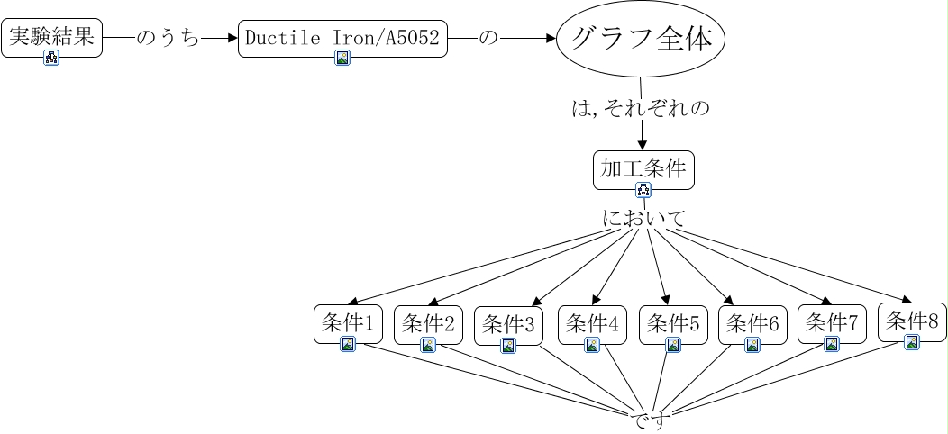 このコンセプトマップに関連する情報: Ductile Iron_A5052(グラフ全体), グラフ全体 は,それぞれの 加工条件, 加工条件 において 条件4, Ductile Iron/A5052 の グラフ全体, 加工条件 において 条件3, 実験結果 のうち Ductile Iron/A5052, 加工条件 において 条件1, 加工条件 において 条件5, 加工条件 において 条件8, 加工条件 において 条件2, 加工条件 において 条件6, 加工条件 において 条件7