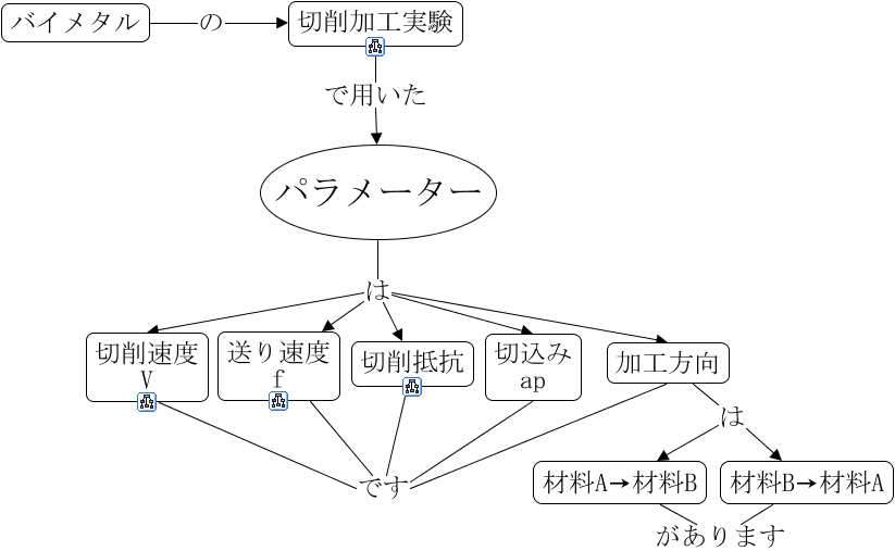 このコンセプトマップに関連する情報: パラメーター, 加工方向 は 材料A→材料B, パラメーター は 送り速度 f, パラメーター は 切削抵抗, 加工方向 は 材料B→材料A, パラメーター は 加工方向, パラメーター は 切削速度 V, 切削加工実験 で用いた パラメーター, バイメタル の 切削加工実験, パラメーター は 切込み ap