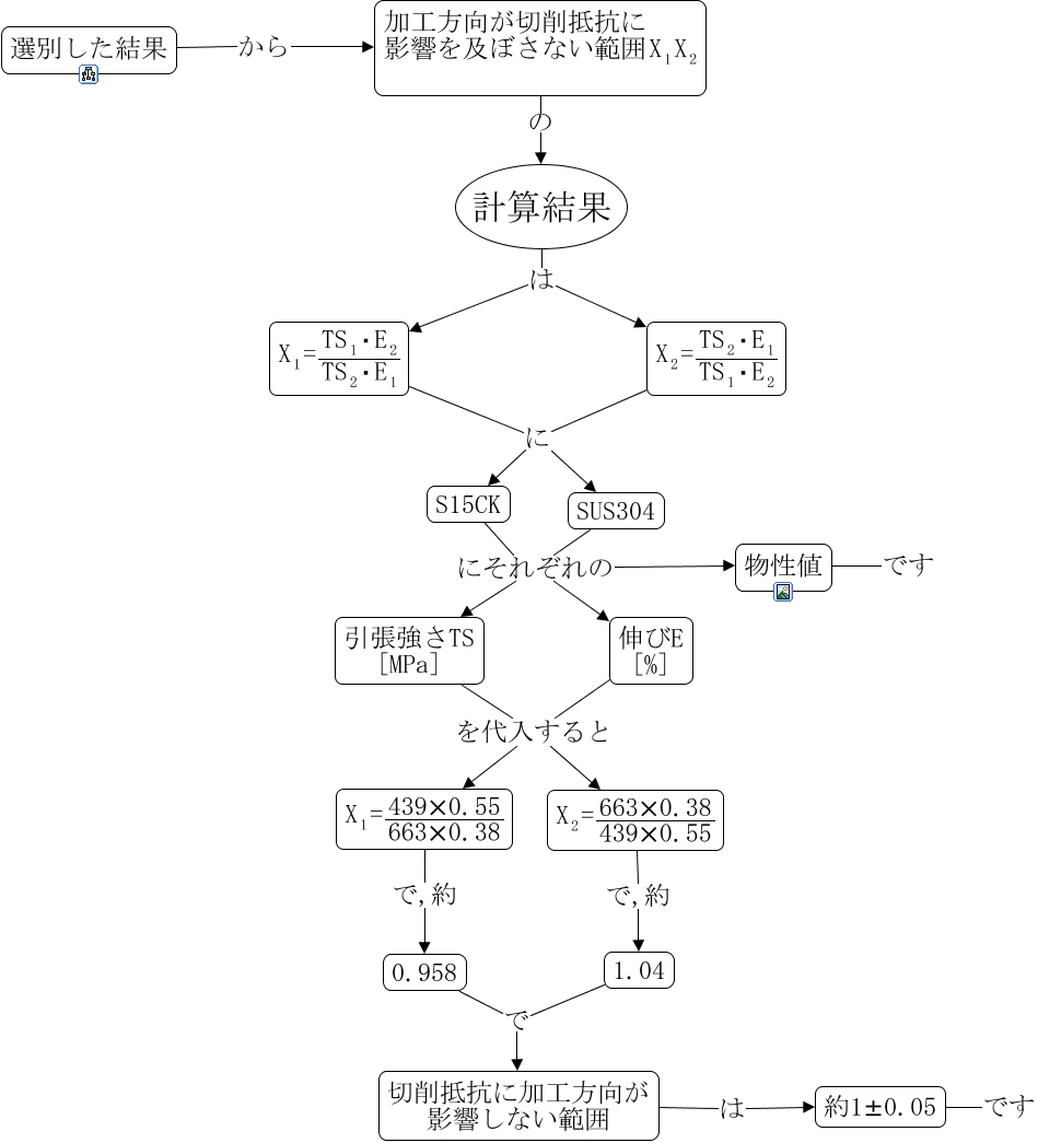 </mtext> <mmultiscripts> <mtext> X </mtext> <mtext> 1 </mtext> <none/> </mmultiscripts> <mmultiscripts> <mtext> X </mtext> <mtext> 2 </mtext> <none/> </mmultiscripts> </mrow> </math>, S15CK にそれぞれの 物性値, SUS304 にそれぞれの 伸びE [%], SUS304 にそれぞれの 引張強さTS [MPa], <math xmlns="http://www.w3.org/1998/Math/MathML"> <mrow> <mmultiscripts> <mtext> X </mtext> <mtext> 2 </mtext> <none/> </mmultiscripts> <mtext> = </mtext> <mfrac> <mrow> <mmultiscripts> <mtext> TS </mtext> <mtext> 2 </mtext> <none/> </mmultiscripts> <mtext> ⋅ </mtext> <mmultiscripts> <mtext> E </mtext> <mtext> 1 </mtext> <none/> </mmultiscripts> </mrow> <mrow> <mmultiscripts> <mtext> TS </mtext> <mtext> 1 </mtext> <none/> </mmultiscripts> <mtext> ⋅ </mtext> <mmultiscripts> <mtext> E </mtext> <mtext> 2 </mtext> <none/> </mmultiscripts> </mrow> </mfrac> </mrow> </math> に S15CK, 切削抵抗に加工方向が 影響しない範囲 は 約1±0.05, 引張強さTS [MPa] を代入すると <math xmlns="http://www.w3.org/1998/Math/MathML"> <mrow> <mmultiscripts> <mtext> X </mtext> <mtext> 2 </mtext> <none/> </mmultiscripts> <mtext> = </mtext> <mfrac> <mtext> 663×0.38 </mtext> <mtext> 439×0.55 </mtext> </mfrac> </mrow> </math>, 1.04 で 切削抵抗に加工方向が 影響しない範囲, 伸びE [%] を代入すると <math xmlns="http://www.w3.org/1998/Math/MathML"> <mrow> <mmultiscripts> <mtext> X </mtext> <mtext> 1 </mtext> <none/> </mmultiscripts> <mtext> = </mtext> <mfrac> <mtext> 439×0.55 </mtext> <mtext> 663×0.38 </mtext> </mfrac> </mrow> </math>, <math xmlns="http://www.w3.org/1998/Math/MathML"> <mrow> <mmultiscripts> <mtext> X </mtext> <mtext> 1 </mtext> <none/> </mmultiscripts> <mtext> = </mtext> <mfrac> <mtext> 439×0.55 </mtext> <mtext> 663×0.38 </mtext> </mfrac> </mrow> </math> で,約 0.958, <math xmlns="http://www.w3.org/1998/Math/MathML"> <mrow> <mtext> 加工方向が切削抵抗に