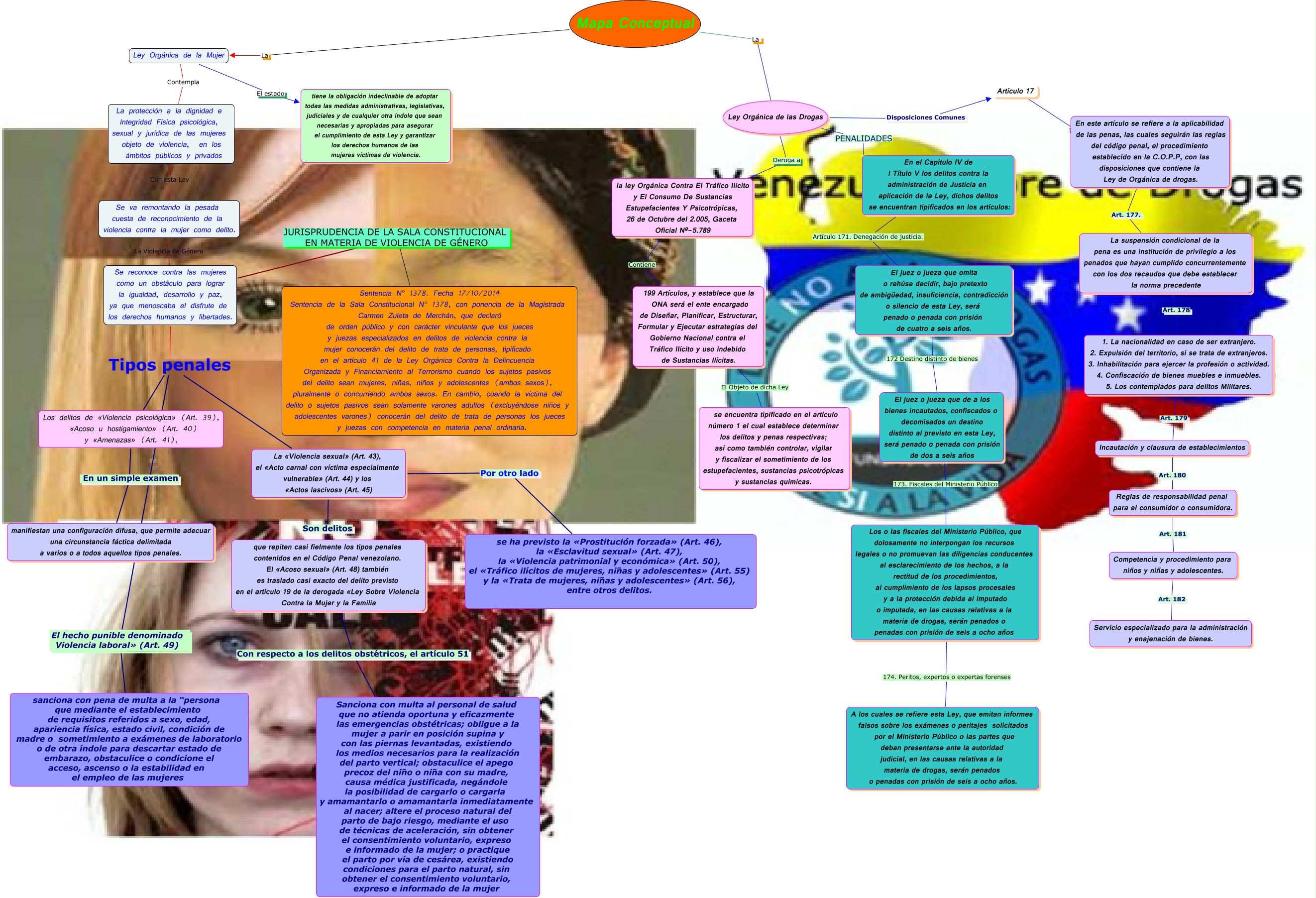 Este Cmap, tiene información relacionada con: Mapa Conceptual Ley de la Mujer y Drogas 2, El hecho punible denominado Violencia laboral» (Art. 49) ???? sanciona con pena de multa a la “persona que mediante el establecimiento de requisitos referidos a sexo, edad, apariencia física, estado civil, condición de madre o sometimiento a exámenes de laboratorio o de otra índole para descartar estado de embarazo, obstaculice o condicione el acceso, ascenso o la estabilidad en el empleo de las mujeres, Se reconoce contra las mujeres como un obstáculo para lograr la igualdad, desarrollo y paz, ya que menoscaba el disfrute de los derechos humanos y libertades. Tipos penales La «Violencia sexual» (Art. 43), el «Acto carnal con víctima especialmente vulnerable» (Art. 44) y los «Actos lascivos» (Art. 45), En el Capítulo IV de l Título V los delitos contra la administración de Justicia en aplicación de la Ley, dichos delitos se encuentran tipificados en los artículos: Artículo 171. Denegación de justicia. El juez o jueza que omita o rehúse decidir, bajo pretexto de ambigüedad, insuficiencia, contradicción o silencio de esta Ley, será penado o penada con prisión de cuatro a seis años., Ley Orgánica de las Drogas Deroga a la ley Orgánica Contra El Tráfico Ilícito y El Consumo De Sustancias Estupefacientes Y Psicotrópicas, 26 de Octubre del 2.005, Gaceta Oficial Nº-5.789, El juez o jueza que omita o rehúse decidir, bajo pretexto de ambigüedad, insuficiencia, contradicción o silencio de esta Ley, será penado o penada con prisión de cuatro a seis años. 172 Destino distinto de bienes El juez o jueza que de a los bienes incautados, confiscados o decomisados un destino distinto al previsto en esta Ley, será penado o penada con prisión de dos a seis años, La «Violencia sexual» (Art. 43), el «Acto carnal con víctima especialmente vulnerable» (Art. 44) y los «Actos lascivos» (Art. 45) Por otro lado se ha previsto la «Prostitución forzada» (Art. 46), la «Esclavitud sexual» (Art. 47), la «Violencia patrimonial y económica» (Art. 50), el «Tráfico ilícitos de mujeres, niñas y adolescentes» (Art. 55) y la «Trata de mujeres, niñas y adolescentes» (Art. 56), entre otros delitos., 1. La nacionalidad en caso de ser extranjero. 2. Expulsión del territorio, si se trata de extranjeros. 3. Inhabilitación para ejercer la profesión o actividad. 4. Confiscación de bienes muebles e inmuebles. 5. Los contemplados para delitos Militares. Art. 179 Incautación y clausura de establecimientos, Mapa Conceptual La Ley Orgánica de la Mujer, En este artículo se refiere a la aplicabilidad de las penas, las cuales seguirán las reglas del código penal, el procedimiento establecido en la C.O.P.P, con las disposiciones que contiene la Ley de Orgánica de drogas. Art. 177. La suspensión condicional de la pena es una institución de privilegio a los penados que hayan cumplido concurrentemente con los dos recaudos que debe establecer la norma precedente, Los delitos de «Violencia psicológica» (Art. 39), «Acoso u hostigamiento» (Art. 40) y «Amenazas» (Art. 41), En un simple examen manifiestan una configuración difusa, que permite adecuar una circunstancia fáctica delimitada a varios o a todos aquellos tipos penales., La suspensión condicional de la pena es una institución de privilegio a los penados que hayan cumplido concurrentemente con los dos recaudos que debe establecer la norma precedente Art. 178 1. La nacionalidad en caso de ser extranjero. 2. Expulsión del territorio, si se trata de extranjeros. 3. Inhabilitación para ejercer la profesión o actividad. 4. Confiscación de bienes muebles e inmuebles. 5. Los contemplados para delitos Militares., la ley Orgánica Contra El Tráfico Ilícito y El Consumo De Sustancias Estupefacientes Y Psicotrópicas, 26 de Octubre del 2.005, Gaceta Oficial Nº-5.789 Contiene 199 Artículos, y establece que la ONA será el ente encargado de Diseñar, Planificar, Estructurar, Formular y Ejecutar estrategias del Gobierno Nacional contra el Tráfico Ilícito y uso indebido de Sustancias Ilícitas., Se reconoce contra las mujeres como un obstáculo para lograr la igualdad, desarrollo y paz, ya que menoscaba el disfrute de los derechos humanos y libertades. JURISPRUDENCIA DE LA SALA CONSTITUCIONAL EN MATERIA DE VIOLENCIA DE GÉNERO Sentencia N° 1378. Fecha 17/10/2014 Sentencia de la Sala Constitucional N° 1378, con ponencia de la Magistrada Carmen Zuleta de Merchán, que declaró de orden público y con carácter vinculante que los jueces y juezas especializados en delitos de violencia contra la mujer conocerán del delito de trata de personas, tipificado en el artículo 41 de la Ley Orgánica Contra la Delincuencia Organizada y Financiamiento al Terrorismo cuando los sujetos pasivos del delito sean mujeres, niñas, niños y adolescentes (ambos sexos), pluralmente o concurriendo ambos sexos. En cambio, cuando la víctima del delito o sujetos pasivos sean solamente varones adultos (excluyéndose niños y adolescentes varones) conocerán del delito de trata de personas los jueces y juezas con competencia en materia penal ordinaria., Ley Orgánica de las Drogas PENALIDADES En el Capítulo IV de l Título V los delitos contra la administración de Justicia en aplicación de la Ley, dichos delitos se encuentran tipificados en los artículos:, Ley Orgánica de la Mujer Contempla La protección a la dignidad e Integridad Física psicológica, sexual y jurídica de las mujeres objeto de violencia, en los ámbitos públicos y privados, La «Violencia sexual» (Art. 43), el «Acto carnal con víctima especialmente vulnerable» (Art. 44) y los «Actos lascivos» (Art. 45) Son delitos que repiten casi fielmente los tipos penales contenidos en el Código Penal venezolano. El «Acoso sexual» (Art. 48) también es traslado casi exacto del delito previsto en el artículo 19 de la derogada «Ley Sobre Violencia Contra la Mujer y la Familia, 