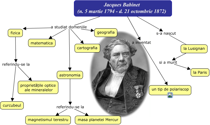 This Concept Map, created with IHMC CmapTools, has information related to: Untitled 1, Jacques Babinet (n. 5 martie 1794 - d. 21 octombrie 1872) a studiat domeniile astronomia, Jacques Babinet (n. 5 martie 1794 - d. 21 octombrie 1872) a inventat un tip de polariscop, Jacques Babinet (n. 5 martie 1794 - d. 21 octombrie 1872) a studiat domeniile cartografia, Jacques Babinet (n. 5 martie 1794 - d. 21 octombrie 1872) a studiat domeniile fizica, Jacques Babinet (n. 5 martie 1794 - d. 21 octombrie 1872) s-a nascut la Lusignan, la Lusignan si a murit la Paris, fizica referindu-se la curcubeul, Jacques Babinet (n. 5 martie 1794 - d. 21 octombrie 1872) a studiat domeniile matematica, astronomia referindu-se la magnetismul terestru, fizica referindu-se la proprietățile optice ale mineralelor, Jacques Babinet (n. 5 martie 1794 - d. 21 octombrie 1872) a studiat domeniile geografia, astronomia referindu-se la masa planetei Mercur
