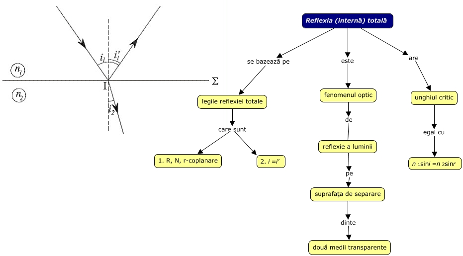 This Concept Map, created with IHMC CmapTools, has information related to: Reflexia totală, Reflexia (internă) totală se bazează pe legile reflexiei totale, fenomenul optic de reflexie a luminii, reflexie a luminii pe suprafaţa de separare, unghiul critic egal cu n1sini=n2sinr, Reflexia (internă) totală are unghiul critic, Reflexia (internă) totală este fenomenul optic, legile reflexiei totale care sunt 1. R, N, r-coplanare, legile reflexiei totale care sunt 2. i=i', suprafaţa de separare dinte două medii transparente