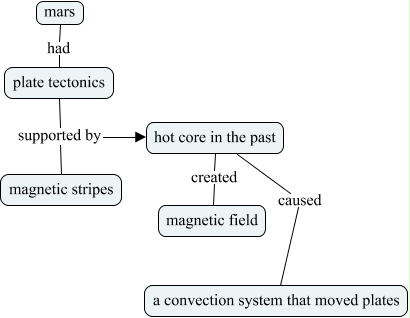 This Concept Map, created with IHMC CmapTools, has information related to: mars, mars had plate tectonics, plate tectonics supported by magnetic stripes, hot core in the past caused a convection system that moved plates, hot core in the past created magnetic field, plate tectonics supported by hot core in the past