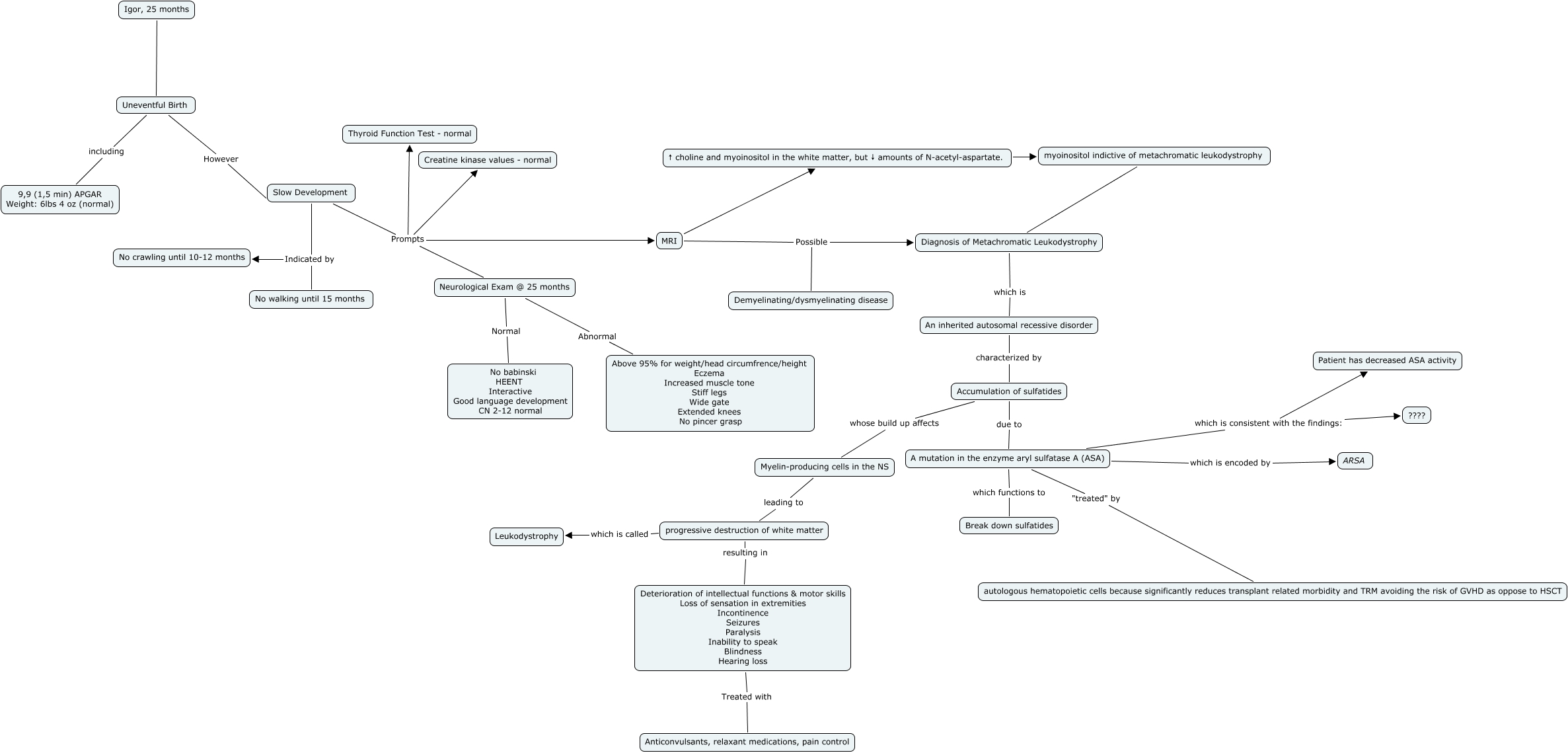 This Concept Map, created with IHMC CmapTools, has information related to: IGOR, Deterioration of intellectual functions & motor skills Loss of sensation in extremities Incontinence Seizures Paralysis Inability to speak Blindness Hearing loss Treated with Anticonvulsants, relaxant medications, pain control, Diagnosis of Metachromatic Leukodystrophy which is An inherited autosomal recessive disorder, Neurological Exam @ 25 months Abnormal Above 95% for weight/head circumfrence/height Eczema Increased muscle tone Stiff legs Wide gate Extended knees No pincer grasp, ↑ choline and myoinositol in the white matter, but ↓ amounts of N-acetyl-aspartate. myoinositol indictive of metachromatic leukodystrophy, MRI Possible Diagnosis of Metachromatic Leukodystrophy, Uneventful Birth However Slow Development, A mutation in the enzyme aryl sulfatase A (ASA) which is encoded by ARSA, MRI ↑ choline and myoinositol in the white matter, but ↓ amounts of N-acetyl-aspartate., An inherited autosomal recessive disorder characterized by Accumulation of sulfatides, Slow Development Prompts MRI, Accumulation of sulfatides due to A mutation in the enzyme aryl sulfatase A (ASA), Uneventful Birth including 9,9 (1,5 min) APGAR Weight: 6lbs 4 oz (normal), Slow Development Indicated by No crawling until 10-12 months, A mutation in the enzyme aryl sulfatase A (ASA) "treated" by autologous hematopoietic cells because significantly reduces transplant related morbidity and TRM avoiding the risk of GVHD as oppose to HSCT, Igor, 25 months Uneventful Birth, Slow Development Prompts Neurological Exam @ 25 months, Slow Development Prompts Thyroid Function Test - normal, Myelin-producing cells in the NS leading to progressive destruction of white matter, myoinositol indictive of metachromatic leukodystrophy Diagnosis of Metachromatic Leukodystrophy, A mutation in the enzyme aryl sulfatase A (ASA) which is consistent with the findings: ????