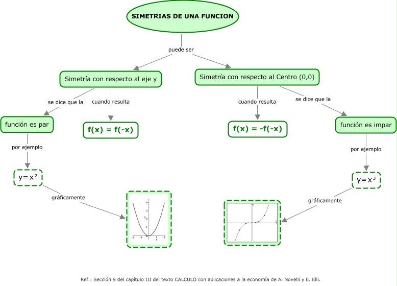 Este Cmap, tiene información relacionada con: SIMETRIAS DE UNA FUNCION, Simetría con respecto al eje y cuando resulta f(x) = f(-x), Simetría con respecto al Centro (0,0) cuando resulta f(x) = -f(-x), función es impar por ejemplo <math xmlns="http://www.w3.org/1998/Math/MathML"> <mrow> <mtext> y= </mtext> <mmultiscripts> <mtext> x </mtext> <none/> <mtext> 3 </mtext> </mmultiscripts> </mrow> </math>, SIMETRIAS DE UNA FUNCION puede ser Simetría con respecto al eje y, <math xmlns="http://www.w3.org/1998/Math/MathML"> <mrow> <mtext> y= </mtext> <mmultiscripts> <mtext> x </mtext> <none/> <mtext> 3 </mtext> </mmultiscripts> </mrow> </math> gráficamente, función es par por ejemplo <math xmlns="http://www.w3.org/1998/Math/MathML"> <mrow> <mtext> y= </mtext> <mmultiscripts> <mtext> x </mtext> <none/> <mtext> 2 </mtext> </mmultiscripts> </mrow> </math>, SIMETRIAS DE UNA FUNCION puede ser Simetría con respecto al Centro (0,0), <math xmlns="http://www.w3.org/1998/Math/MathML"> <mrow> <mtext> y= </mtext> <mmultiscripts> <mtext> x </mtext> <none/> <mtext> 2 </mtext> </mmultiscripts> </mrow> </math> gráficamente, Simetría con respecto al eje y se dice que la función es par, Simetría con respecto al Centro (0,0) se dice que la función es impar
