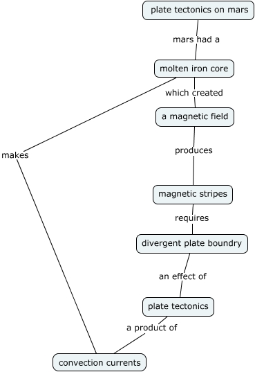 This Concept Map, created with IHMC CmapTools, has information related to: Mars concept map, magnetic stripes requires divergent plate boundry, a magnetic field produces magnetic stripes, divergent plate boundry an effect of plate tectonics, molten iron core makes convection currents, plate tectonics a product of convection currents, molten iron core which created a magnetic field, plate tectonics on mars mars had a molten iron core
