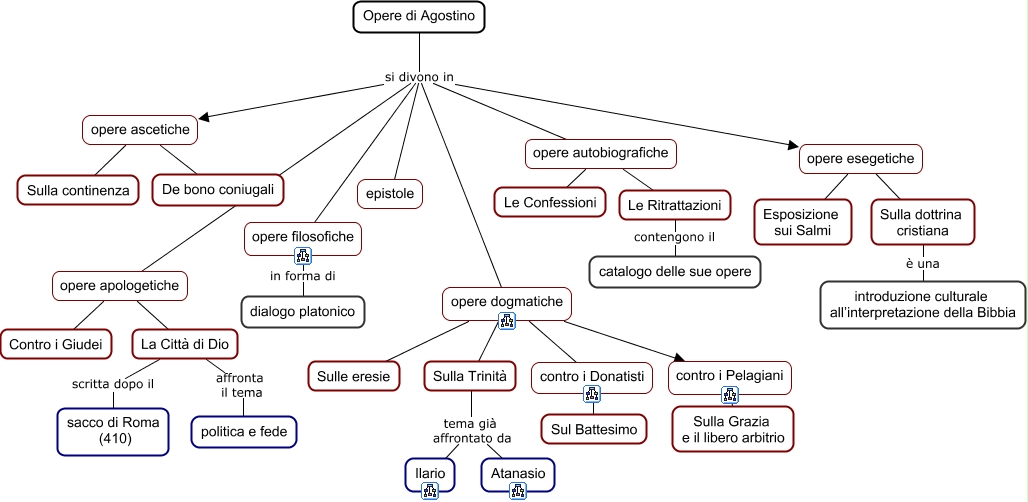 Questa Cmap, creata con IHMC CmapTools, contiene informazioni relative a: 80.3 Agostino - Opere, La Città di Dio scritta dopo il sacco di Roma (410), opere esegetiche Sulla dottrina cristiana, Sulla Trinità tema già affrontato da Atanasio, opere dogmatiche Sulla Trinità, opere autobiografiche Le Confessioni, opere filosofiche in forma di dialogo platonico, Sulla Trinità tema già affrontato da Ilario, Opere di Agostino si divono in opere esegetiche, Opere di Agostino si divono in opere dogmatiche, opere apologetiche Contro i Giudei, Opere di Agostino si divono in opere filosofiche, contro i Donatisti Sul Battesimo, opere esegetiche Esposizione sui Salmi, opere apologetiche La Città di Dio, opere dogmatiche contro i Donatisti, La Città di Dio affronta il tema politica e fede, contro i Pelagiani Sulla Grazia e il libero arbitrio, Sulla dottrina cristiana è una introduzione culturale all’interpretazione della Bibbia, opere dogmatiche contro i Pelagiani, opere dogmatiche Sulle eresie
