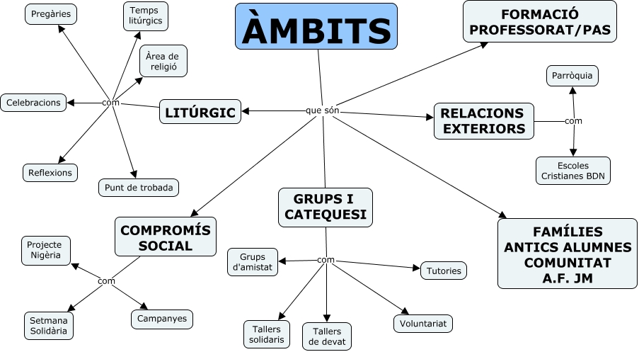 Aquest mapa conceptual conté informació relacionada amb: pastoral, ÀMBITS que són FAMÍLIES ANTICS ALUMNES COMUNITAT A.F. JM, LITÚRGIC com Pregàries, LITÚRGIC com Celebracions, GRUPS I CATEQUESI com Tutories, LITÚRGIC com Punt de trobada, ÀMBITS que són RELACIONS EXTERIORS, LITÚRGIC com Àrea de religió, GRUPS I CATEQUESI com Voluntariat, COMPROMÍS SOCIAL com Setmana Solidària, LITÚRGIC com Temps litúrgics, RELACIONS EXTERIORS com Escoles Cristianes BDN, LITÚRGIC com Reflexions, COMPROMÍS SOCIAL com Projecte Nigèria, COMPROMÍS SOCIAL com Campanyes, GRUPS I CATEQUESI com Grups d'amistat, GRUPS I CATEQUESI com Tallers de devat, ÀMBITS que són FORMACIÓ PROFESSORAT/PAS, GRUPS I CATEQUESI com Tallers solidaris, RELACIONS EXTERIORS com Parròquia, ÀMBITS que són COMPROMÍS SOCIAL
