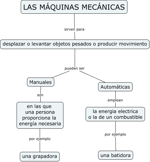 Este Cmap, tiene información relacionada con: las maquinas mecanicas, LAS MÁQUINAS MECÁNICAS sirven para desplazar o levantar objetos pesados o producir movimiento, Automáticas emplean la energia electrica o la de un combustible, desplazar o levantar objetos pesados o producir movimiento pueden ser Manuales, Manuales son en las que una persona proporciona la energía necesaria, en las que una persona proporciona la energía necesaria por ejemplo una grapadora, la energia electrica o la de un combustible por ejemplo una batidora, desplazar o levantar objetos pesados o producir movimiento pueden ser Automáticas