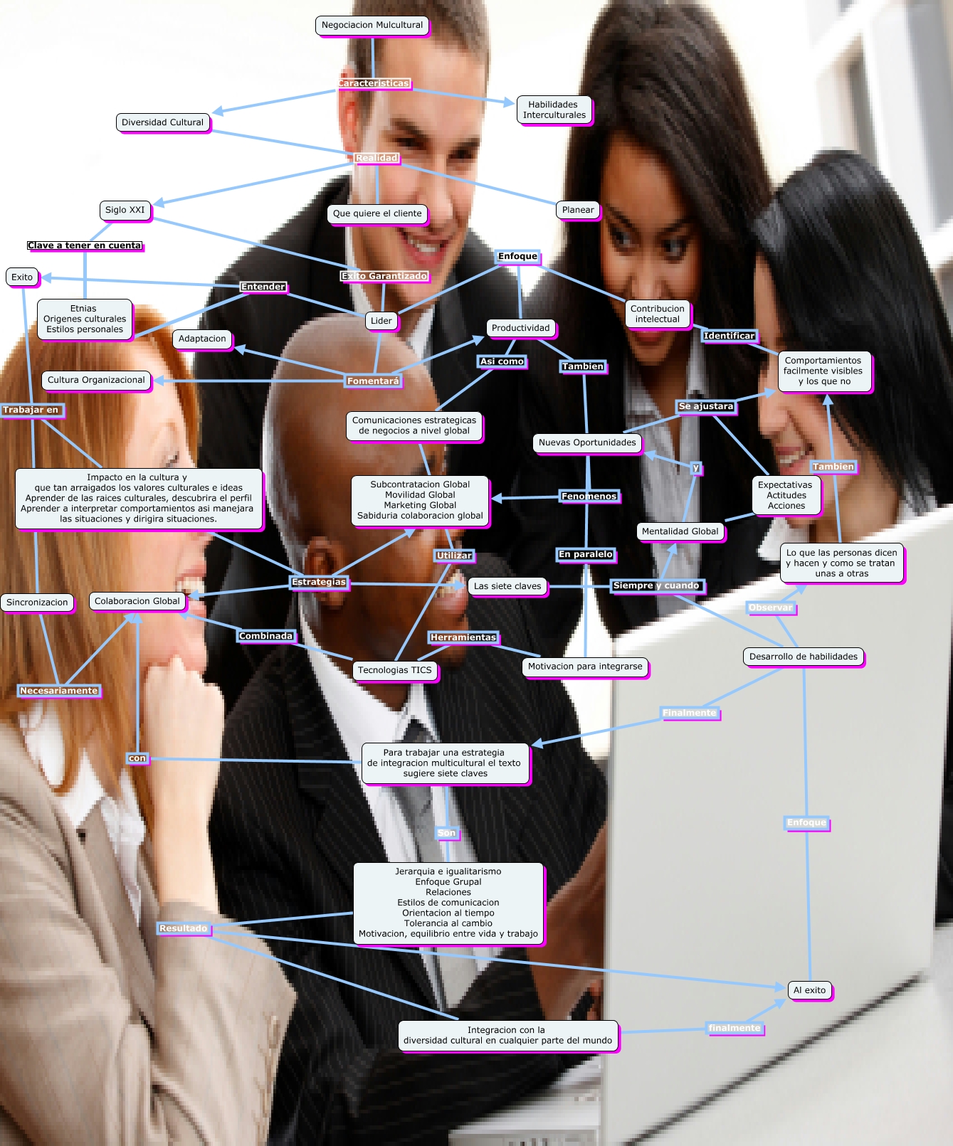 Este Cmap, tiene información relacionada con: Negociación multicultural 2, Nuevas Oportunidades En paralelo Motivacion para integrarse, Negociacion Mulcultural Caracteristicas Habilidades Interculturales, Siglo XXI Clave a tener en cuenta Etnias Origenes culturales Estilos personales, Productividad Tambien Nuevas Oportunidades, Jerarquia e igualitarismo Enfoque Grupal Relaciones Estilos de comunicacion Orientacion al tiempo Tolerancia al cambio Motivacion, equilibrio entre vida y trabajo Resultado Integracion con la diversidad cultural en cualquier parte del mundo, Lider Enfoque Productividad, Contribucion intelectual Identificar Comportamientos facilmente visibles y los que no, Desarrollo de habilidades Finalmente Para trabajar una estrategia de integracion multicultural el texto sugiere siete claves, Para trabajar una estrategia de integracion multicultural el texto sugiere siete claves con Colaboracion Global, Impacto en la cultura y que tan arraigados los valores culturales e ideas Aprender de las raices culturales, descubrira el perfil Aprender a interpretar comportamientos asi manejara las situaciones y dirigira situaciones. Estrategias Subcontratacion Global Movilidad Global Marketing Global Sabiduria colaboracion global, Mentalidad Global ???? Expectativas Actitudes Acciones, Lider Entender Etnias Origenes culturales Estilos personales, Desarrollo de habilidades Observar Lo que las personas dicen y hacen y como se tratan unas a otras, Jerarquia e igualitarismo Enfoque Grupal Relaciones Estilos de comunicacion Orientacion al tiempo Tolerancia al cambio Motivacion, equilibrio entre vida y trabajo Resultado Al exito, Exito Trabajar en Sincronizacion, Impacto en la cultura y que tan arraigados los valores culturales e ideas Aprender de las raices culturales, descubrira el perfil Aprender a interpretar comportamientos asi manejara las situaciones y dirigira situaciones. Estrategias Colaboracion Global, Lider Enfoque Contribucion intelectual, Para trabajar una estrategia de integracion multicultural el texto sugiere siete claves Son Jerarquia e igualitarismo Enfoque Grupal Relaciones Estilos de comunicacion Orientacion al tiempo Tolerancia al cambio Motivacion, equilibrio entre vida y trabajo, Productividad Asi como Comunicaciones estrategicas de negocios a nivel global, Diversidad Cultural Realidad Planear