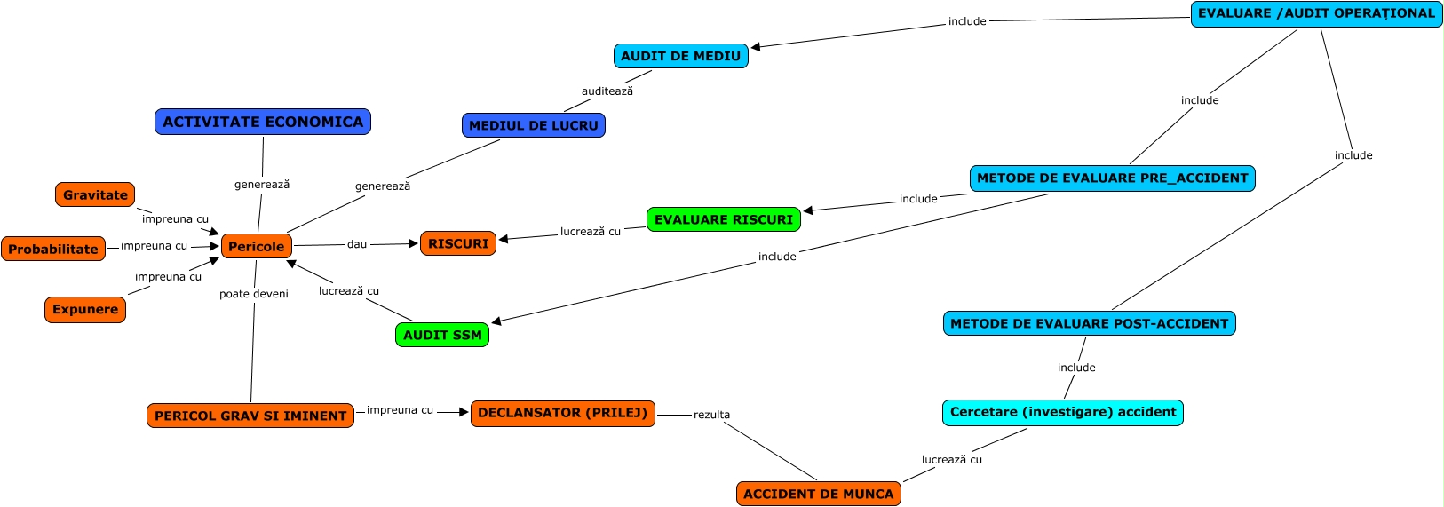 This Concept Map, created with IHMC CmapTools, has information related to: Pericole-2, PERICOL GRAV SI IMINENT impreuna cu DECLANSATOR (PRILEJ), EVALUARE /AUDIT OPERAȚIONAL include METODE DE EVALUARE PRE_ACCIDENT, METODE DE EVALUARE PRE_ACCIDENT include AUDIT SSM, AUDIT DE MEDIU auditează MEDIUL DE LUCRU, Cercetare (investigare) accident lucrează cu ACCIDENT DE MUNCA, Expunere impreuna cu Pericole, MEDIUL DE LUCRU generează Pericole, Gravitate impreuna cu Pericole, EVALUARE RISCURI lucrează cu RISCURI, Pericole poate deveni PERICOL GRAV SI IMINENT, Probabilitate impreuna cu Pericole, EVALUARE /AUDIT OPERAȚIONAL include METODE DE EVALUARE POST-ACCIDENT, ACTIVITATE ECONOMICA generează Pericole, Pericole dau RISCURI, EVALUARE /AUDIT OPERAȚIONAL include AUDIT DE MEDIU, AUDIT SSM lucrează cu Pericole, METODE DE EVALUARE PRE_ACCIDENT include EVALUARE RISCURI, METODE DE EVALUARE POST-ACCIDENT include Cercetare (investigare) accident, DECLANSATOR (PRILEJ) rezulta ACCIDENT DE MUNCA
