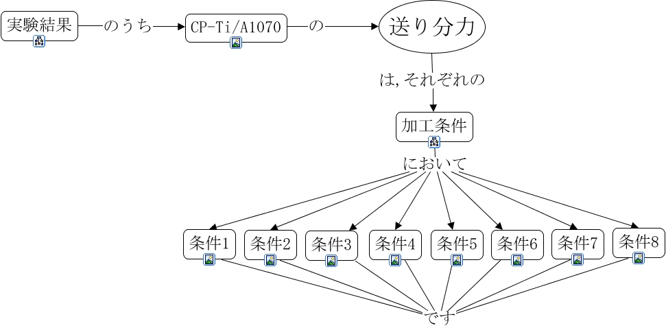 このコンセプトマップに関連する情報: CP-Ti_A1070(送り分力), 送り分力 は,それぞれの 加工条件, 加工条件 において 条件4, CP-Ti/A1070 の 送り分力, 加工条件 において 条件3, 実験結果 のうち CP-Ti/A1070, 加工条件 において 条件1, 加工条件 において 条件5, 加工条件 において 条件8, 加工条件 において 条件2, 加工条件 において 条件6, 加工条件 において 条件7