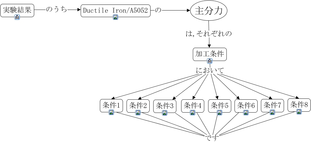 このコンセプトマップに関連する情報: Ductile Iron_A5052(主分力), 主分力 は,それぞれの 加工条件, 加工条件 において 条件4, Ductile Iron/A5052 の 主分力, 加工条件 において 条件3, 実験結果 のうち Ductile Iron/A5052, 加工条件 において 条件1, 加工条件 において 条件5, 加工条件 において 条件8, 加工条件 において 条件2, 加工条件 において 条件6, 加工条件 において 条件7