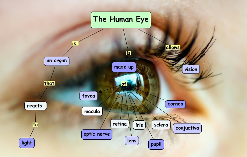 This Concept Map, created with IHMC CmapTools, has information related to: The human eye, made up of macula, made up of fovea, made up of iris, made up of conjuctiva, made up of pupil, The Human Eye allows vision, an organ that reacts, made up of optic nerve, made up of sclera, made up of lens, The Human Eye is made up, made up of cornea, made up of retina, reacts to light, The Human Eye is an organ
