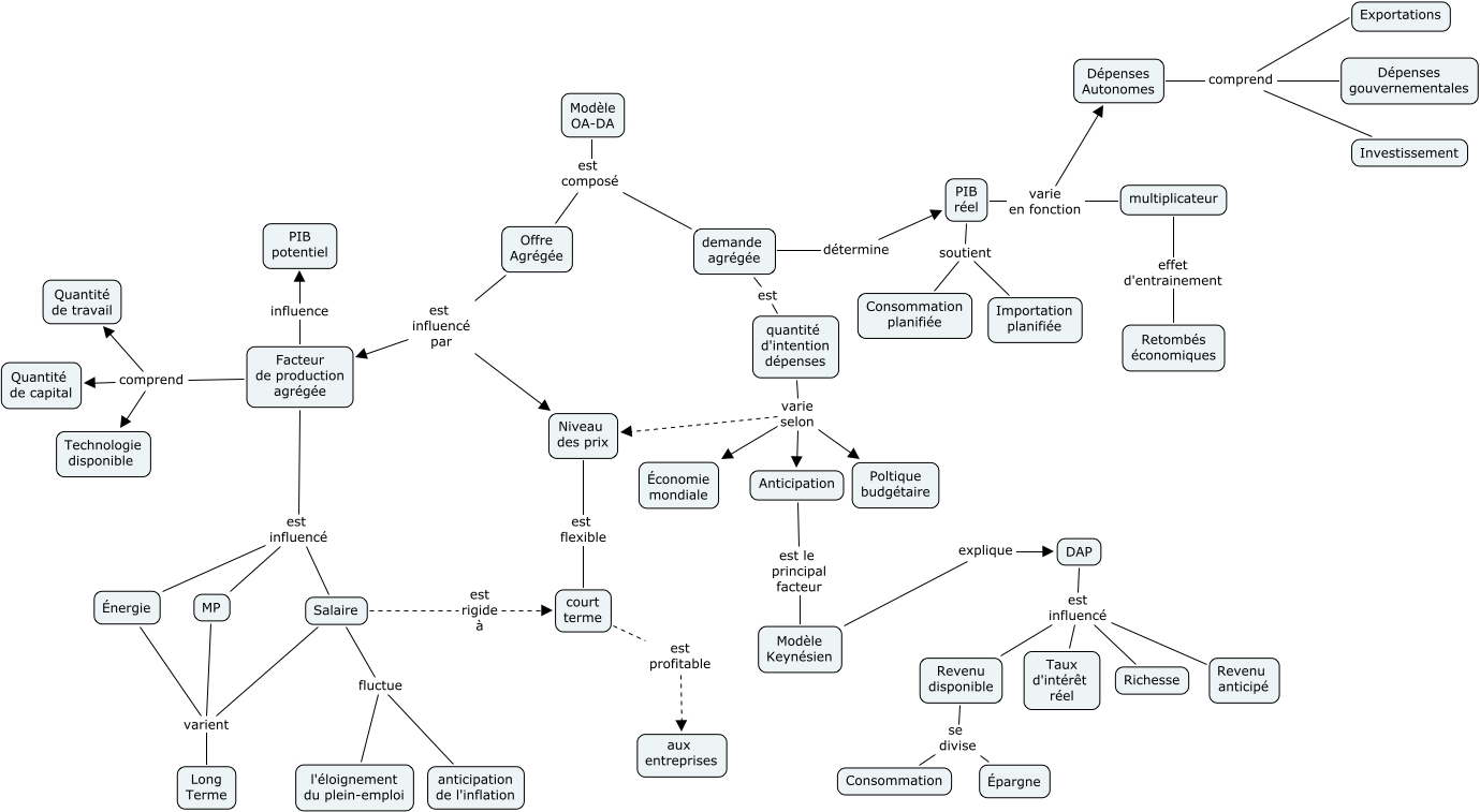 Cette carte de concepts créée avec IHMC CmapTools traite de: Réseau 3, Salaire fluctue l'éloignement du plein-emploi, Modèle OA-DA est composé Offre Agrégée, DAP est influencé Revenu anticipé, Facteur de production agrégée influence PIB potentiel, Facteur de production agrégée comprend Quantité de travail, Dépenses Autonomes comprend Investissement, Salaire varient Long Terme, Salaire est rigide à court terme, Dépenses Autonomes comprend Dépenses gouvernementales, PIB réel soutient Consommation planifiée, Offre Agrégée est influencé par Niveau des prix, Revenu disponible se divise Épargne, DAP est influencé Taux d'intérêt réel, PIB réel soutient Importation planifiée, Facteur de production agrégée est influencé MP, Modèle Keynésien explique DAP, Facteur de production agrégée est influencé Salaire, Niveau des prix est flexible court terme, MP varient Long Terme, quantité d'intention dépenses varie selon Économie mondiale