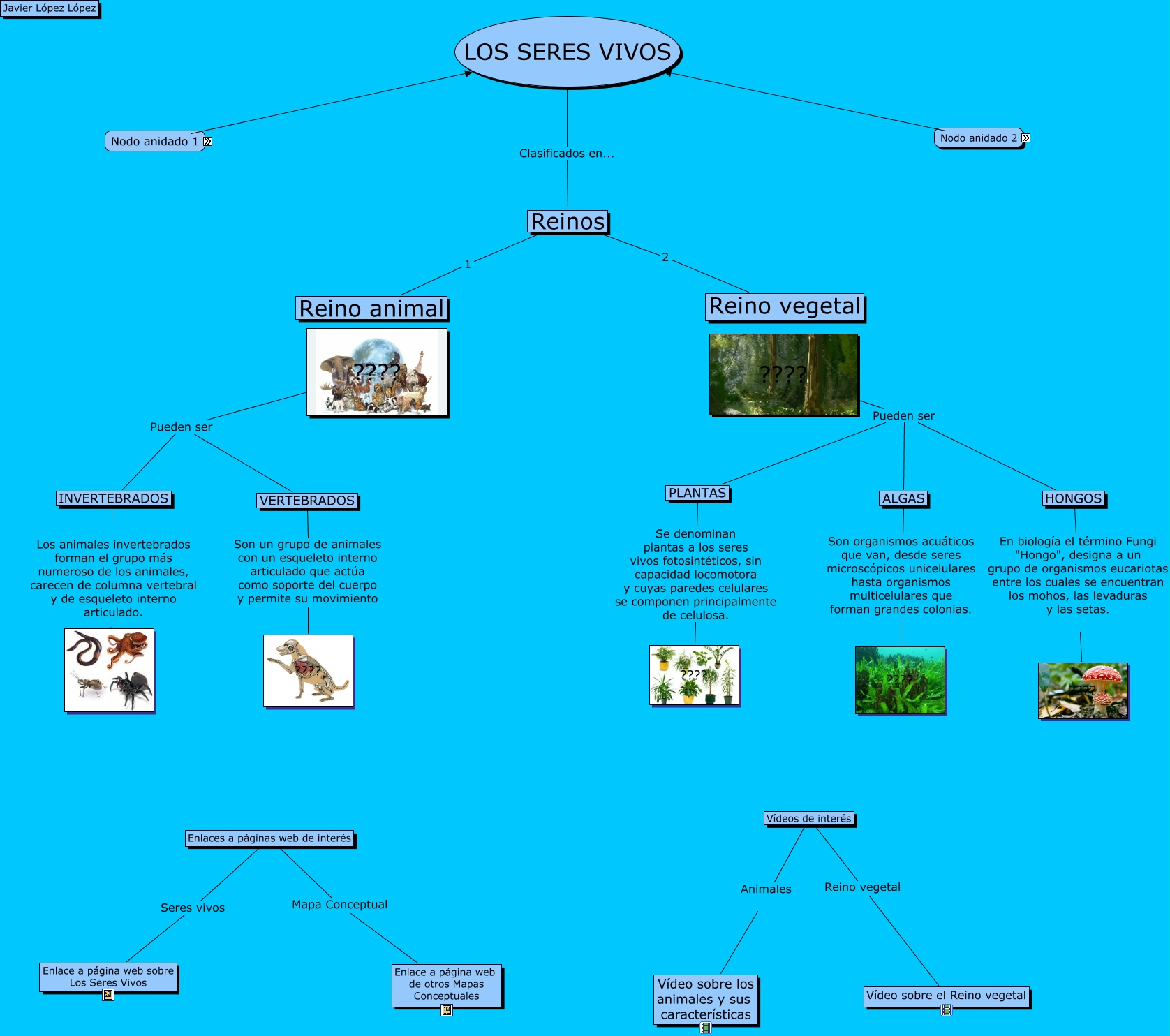 Este Cmap, tiene información relacionada con: Javier López López Seres vivos, ???? Pueden ser VERTEBRADOS, Vídeos de interés Reino vegetal Vídeo sobre el Reino vegetal, Reinos 1 Reino animal, VERTEBRADOS Son un grupo de animales con un esqueleto interno articulado que actúa como soporte del cuerpo y permite su movimiento ????, HONGOS En biología el término Fungi "Hongo", designa a un grupo de organismos eucariotas entre los cuales se encuentran los mohos, las levaduras y las setas. ????, INVERTEBRADOS Los animales invertebrados forman el grupo más numeroso de los animales, carecen de columna vertebral y de esqueleto interno articulado., Vídeo sobre los animales y sus características Nodo anidado LOS SERES VIVOS, ???? Pueden ser PLANTAS, LOS SERES VIVOS Clasificados en... Reinos, ???? Pueden ser INVERTEBRADOS, Nodo anidado 2 Nodo anidado LOS SERES VIVOS, Enlaces a páginas web de interés Seres vivos Enlace a página web sobre Los Seres Vivos, ALGAS Son organismos acuáticos que van, desde seres microscópicos unicelulares hasta organismos multicelulares que forman grandes colonias. ????, Vídeos de interés Animales Vídeo sobre los animales y sus características, Enlaces a páginas web de interés Mapa Conceptual Enlace a página web de otros Mapas Conceptuales, ???? Pueden ser ALGAS, Reinos 2 Reino vegetal, PLANTAS Se denominan plantas a los seres vivos fotosintéticos, sin capacidad locomotora y cuyas paredes celulares se componen principalmente de celulosa. ????, ???? Pueden ser HONGOS