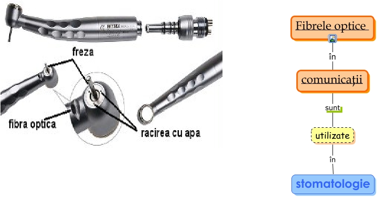 This Concept Map, created with IHMC CmapTools, has information related to: Fibre optice in stomatologie, Fibrele optice în comunicaţii, comunicaţii sunt utilizate, utilizate în stomatologie