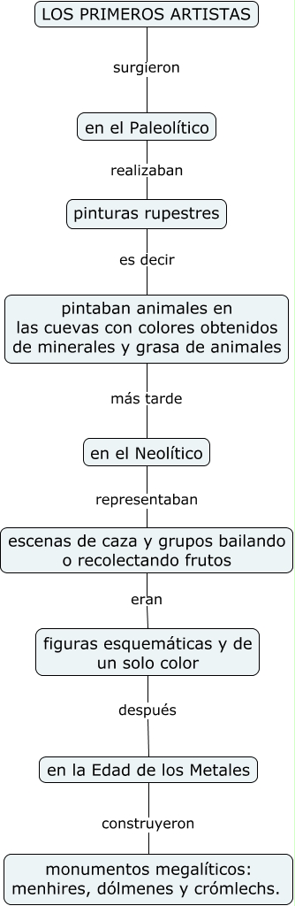 Este Cmap, tiene información relacionada con: Los primeros artistas, pinturas rupestres es decir pintaban animales en las cuevas con colores obtenidos de minerales y grasa de animales, figuras esquemáticas y de un solo color después en la Edad de los Metales, en el Paleolítico realizaban pinturas rupestres, en la Edad de los Metales construyeron monumentos megalíticos: menhires, dólmenes y crómlechs., LOS PRIMEROS ARTISTAS surgieron en el Paleolítico, pintaban animales en las cuevas con colores obtenidos de minerales y grasa de animales más tarde en el Neolítico, escenas de caza y grupos bailando o recolectando frutos eran figuras esquemáticas y de un solo color, en el Neolítico representaban escenas de caza y grupos bailando o recolectando frutos