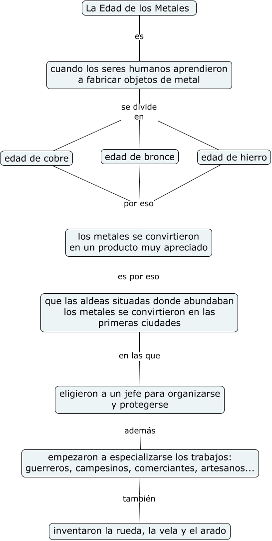 Este Cmap, tiene información relacionada con: La Edad de los Metales, eligieron a un jefe para organizarse y protegerse además empezaron a especializarse los trabajos: guerreros, campesinos, comerciantes, artesanos..., La Edad de los Metales es cuando los seres humanos aprendieron a fabricar objetos de metal, empezaron a especializarse los trabajos: guerreros, campesinos, comerciantes, artesanos... también inventaron la rueda, la vela y el arado, los metales se convirtieron en un producto muy apreciado es por eso que las aldeas situadas donde abundaban los metales se convirtieron en las primeras ciudades, edad de cobre por eso los metales se convirtieron en un producto muy apreciado, que las aldeas situadas donde abundaban los metales se convirtieron en las primeras ciudades en las que eligieron a un jefe para organizarse y protegerse, edad de hierro por eso los metales se convirtieron en un producto muy apreciado, edad de bronce por eso los metales se convirtieron en un producto muy apreciado, cuando los seres humanos aprendieron a fabricar objetos de metal se divide en edad de bronce, cuando los seres humanos aprendieron a fabricar objetos de metal se divide en edad de cobre, cuando los seres humanos aprendieron a fabricar objetos de metal se divide en edad de hierro
