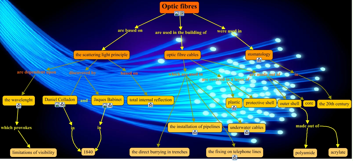This Concept Map, created with IHMC CmapTools, has information related to: The use of optic fibres in telecommunications, Optic fibres are used in the building of optic fibre cables, Optic fibres were used in stomatology, Daniel Colladon and Jaques Babinet, optic fibre cables are made out of outer shell, Daniel Colladon in 1840, the scattering light principle discovered by Jaques Babinet, optic fibre cables which are used in underwater cables, the scattering light principle based on total internal reflection, optic fibre cables are covered in a layer of protective shell, Optic fibres are based on the scattering light principle, outer shell made out of polyamide, optic fibre cables which are used in the installation of pipelines, optic fibre cables are made out of core, optic fibre cables which are used in the direct burrying in trenches, optic fibre cables which are used in the fixing on telephone lines, optic fibre cables are covered in a layer of plastic, the scattering light principle discovered by Daniel Colladon, Jaques Babinet in 1840, outer shell made out of acrylate, the scattering light principle are dependent upon the wavelenght